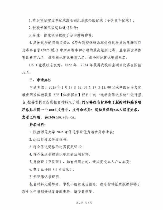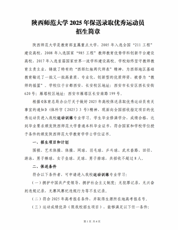 陕西师范大学2025年优秀运动员保送招生简章