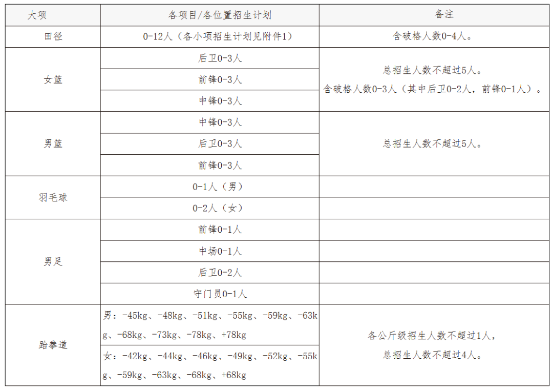 1.符合生源省份高考报名条件,并获得国家一级运动员(含)以上技术等级称号。各项目报名条件及要求详见附件2。2.考生所持运动员技术等级证书中的运动项目应与所报考项目一致(原则上运动小项也应一致,田径项目须严格对应)。3.入学前曾在专业队注册并报名参加过各类专业赛事者,不具备报考资格。考生应于2025年2月20日-2月25日登录中国运动文化教育网“高水平运动队招生系统”(网址https://www.ydyeducation.com/index/tyzs/tyzs_index/on/Y.html)或“体教联盟APP”,按系统提示和要求报名。2.符合报名或破格条件且能够证明本人在高中阶段对应项目取得最好成绩的比赛秩序册、成绩册和获奖证书扫描件,秩序册、成绩册与获奖证书必须一一对应,秩序册和成绩册中必须包含本人页。3.报名集体项目的考生,还需提供对应比赛的主力队员证明材料,证明材料模板详见附件3。4.报名篮球中锋、足球守门员位置的考生,须提供三甲医院出具的身高体检证明。2025年3月1日前,学校对考生的报考资格进行审核。凡上传材料模糊影响辨识或不准确、不完整者,不能通过审核。2025年3月1日后,考生可在报名系统查询审核结果,并按规定时间完成缴费。所有招生项目专业测试全部实施全国统考,统一采用体育总局体育专项考试方法与评分标准进行评分。具体考试安排及其他相关信息以“中国运动文化教育网”及“体教联盟APP”通知为准。所有考生均须参加全国统一高考,文化课考试成绩全部使用全国统一高考文化课考试成绩。根据全国统考成绩,结合招生计划、报名资格审核结果、体育单招录取结果,确定我校各招生项目合格名单,合格名单将按规定在我校本科招生网和教育部阳光高考平台公示。篮球项目优先按照不超过破格计划数1:2比例认定各位置破格录取合格名单,后认定各位置非破格录取合格名单和录取排序。符合破格条件但未被认定为破格录取合格名单的考生,根据全国统考成绩,分位置参与非破格录取合格名单的认定。非破格录取合格比例由学校自定。跆拳道项目按照全国统考成绩不区分性别确定合格名单。田径、羽毛球、足球项目按照全国统考成绩,分小项/性别/位置确定各招生项目合格名单。田径、篮球、足球、跆拳道项目同分比较规则如下:依次按照国家体育总局科教司公布的《体育招生(高校高水平运动队)体育专项考试测试方法与评分标准》(2025版)中规定的相关项目同分排序规则、运动员等级、高中阶段参赛和竞赛获奖最高级别择优确定合格名单。羽毛球项目同分比较规则如下:依次按照国家体育总局科教司公布的《体育招生(高校高水平运动队)体育专项考试测试方法与评分标准》(2025版)中规定的同分排序规则、运动员等级、高中阶段参赛和竞赛获奖最高级别进行比较,参赛和竞赛获奖级别相同的,依次按照单打、双打(含混双)、团体确定优先顺序。田径和篮球项目的考生,如符合我校破格条件,可申请文化课破格录取,破格录取办法详见附件4。1.高考成绩公布后、志愿填报前,对于高考文化课成绩达到录取要求的合格名单内考生,分招生项目(部分项目分性别、小项和位置),根据合格名单的排名顺序,依次择优确定入围考生名单并按规定公示,入围考生人数不超过各招生项目最高招生计划数。破格录取:考生高考成绩(不含政策性加分)须达到生源省份普通类本科批次录取控制分数线的65%;非破格录取:考生高考成绩(不含政策性加分)须达到生源省份普通类本科批次录取控制分数线的80%。2.入围考生名单和信息将报送教育部“阳光高考”平台公示,同时接受生源地省级招生考试机构的审核确认。所有入围考生均须按照生源地省级招生考试机构的相关规定填报我校高水平运动队志愿。高水平运动队录取专业为体育教育专业,考生入校后不允许转入其他专业。对于高考文化课成绩达到我校限定的普通类招生专业在相应省份普通批次录取分数线下20分的考生,可申请就读普通专业,此类考生的科类、选考科目须符合相应的普通专业要求。高水平运动队学生的培养和管理执行专门培养方案,学生入学后须与我校签订协议,接受所在院系和运动队双重管理,既要按本专业培养方案完成专业学习任务,也要认真履行参加训练和比赛的义务。运动员入学前的测试项目必须作为运动员入学后的训练专项和参赛项目,学校将运动队学生参加训练的学时和表现、比赛成绩和突出贡献等情况设为必修学分进行考核,学生须同时通过竞赛和训练年度考核后方能毕业。(一)学校在高水平运动队选拔过程中,遵循“公平、公正、公开、综合评价、择优录取”原则,将选拔办法、标准、程序以及结果向社会公示,接受社会监督。(二)我校教职工子女和亲属报考本校高水平运动队的,须向学校招生办公室报备并在校内公示,教职工本人要全程回避。(三)我校从严查处替考、服用兴奋剂等严重作弊行为,学生本人应本着诚信原则报名并参加测试,如弄虚作假,将对违规考生和有关工作人员严格按照《国家教育考试违规处理办法》、《普通高等学校招生违规行为处理暂行办法》进行处理。(四)高水平运动队学生入学后,须按规定参加体育专项复测,对于复测不合格、入学前后两次测试成绩差异显著的考生,我校将组织专门调查。对于通过弄虚作假、徇私舞弊方式骗取录取资格的学生以及违规录取的