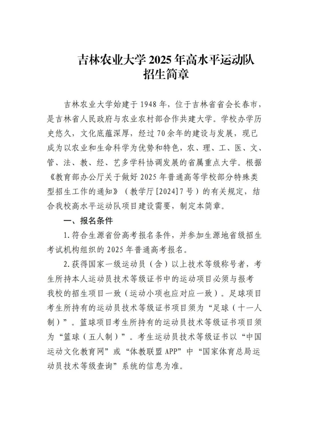 吉林农业大学2025年高水平运动队招生简章