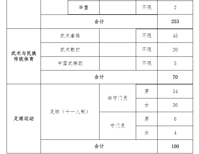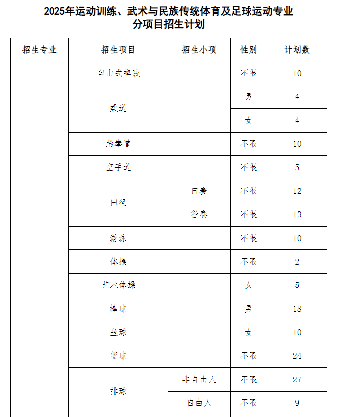 根据学校整体规划,我校2025年运动训练、武术与民族传统体育及足球运动专业分项目招生计划如下: