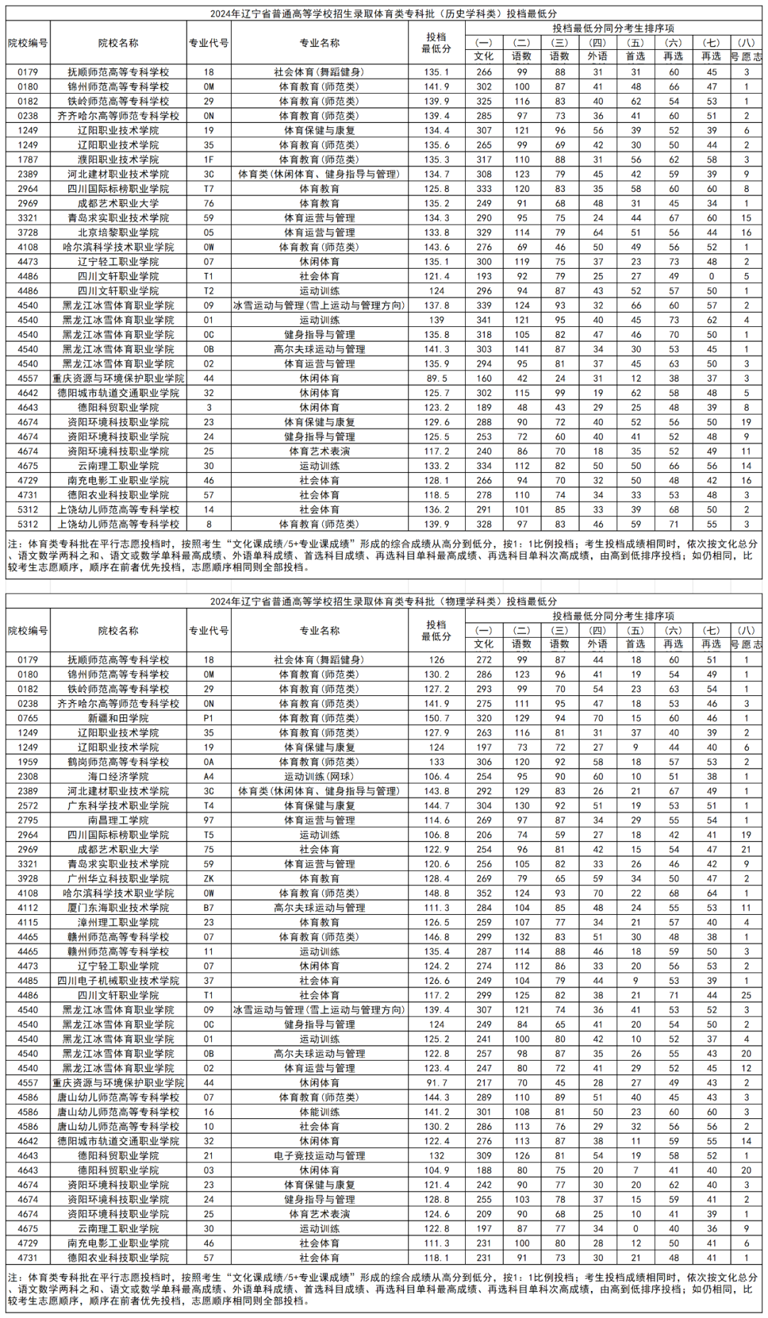 2024年辽宁省普通高等学校招生录取体育类专科批投档最低分
