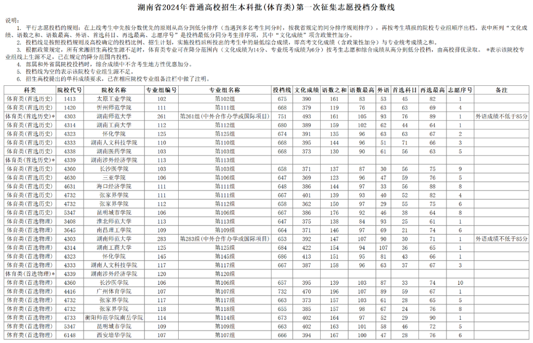 湖南省2024年普通高校招生本科批(体育类)第一次征集志愿投档分数线