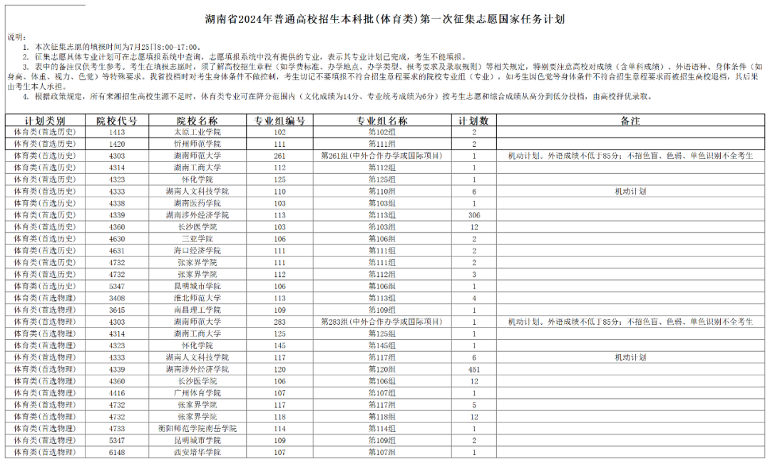 湖南省2024年普通高校招生本科批(体育类)第一次征集志愿国家任务计划