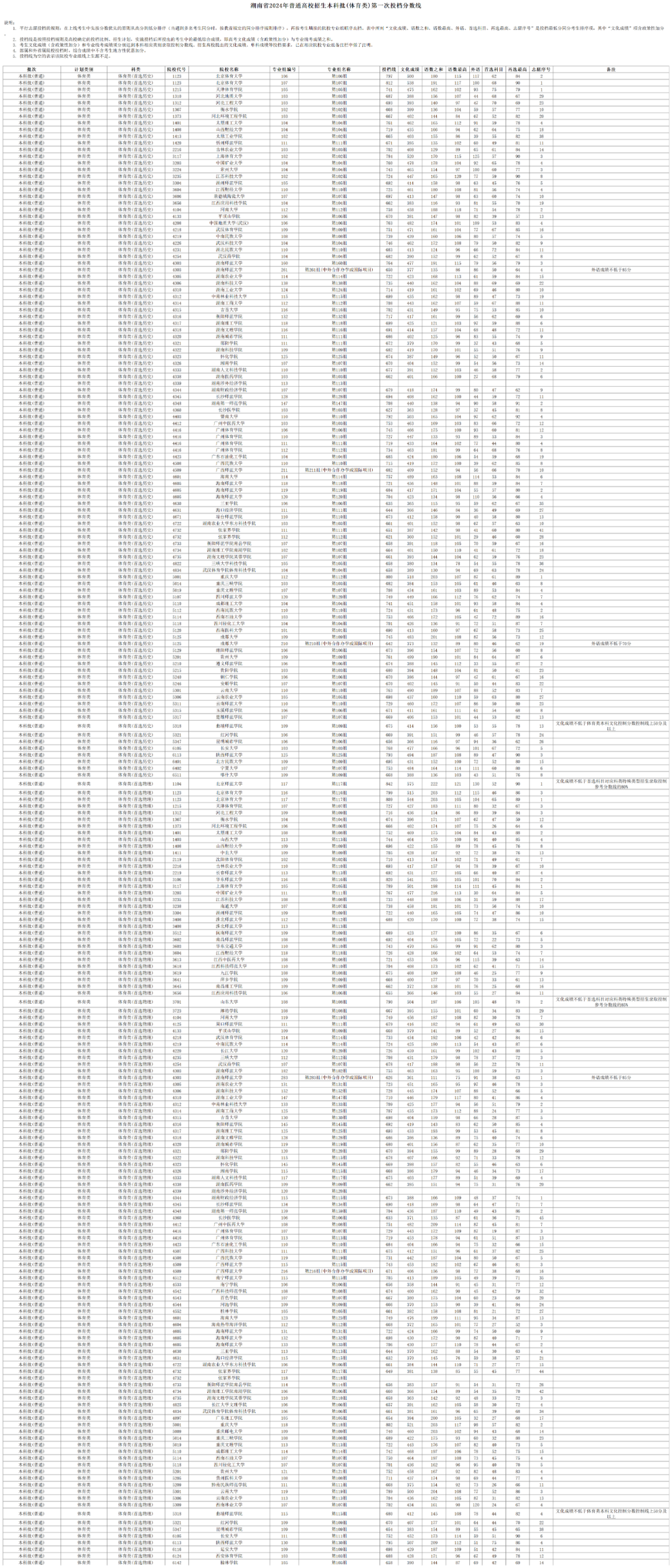 湖南省2024年普通高校招生本科批(体育类)第一次投档分数线