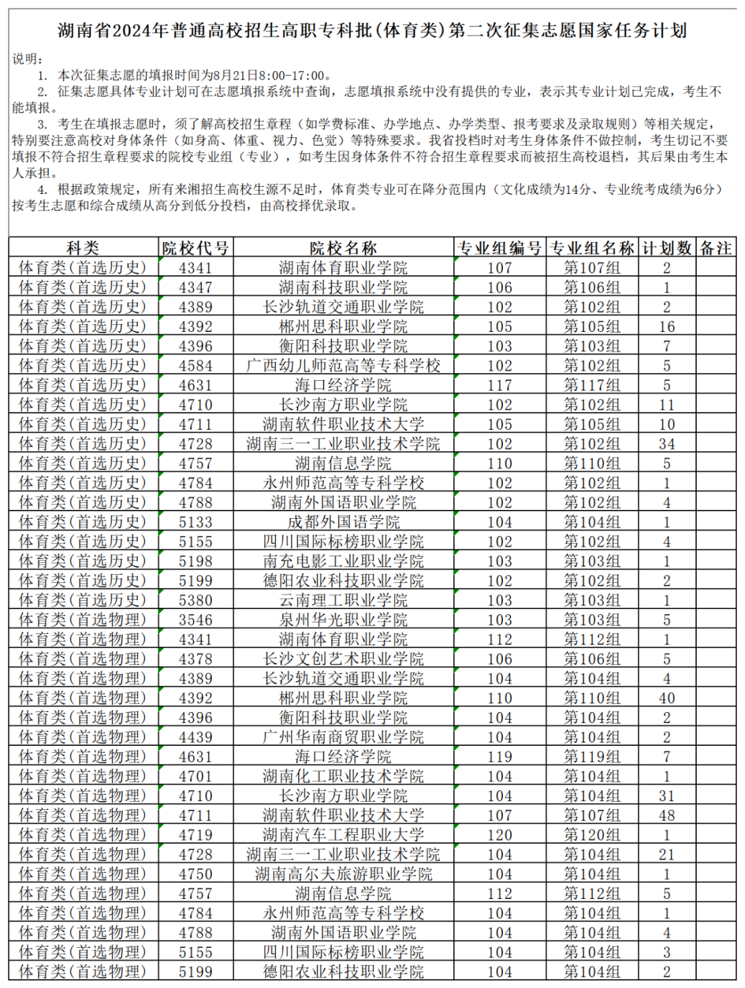 湖南省2024年普通高校招生高职专科批(体育类)第二次征集志愿国家任务计划