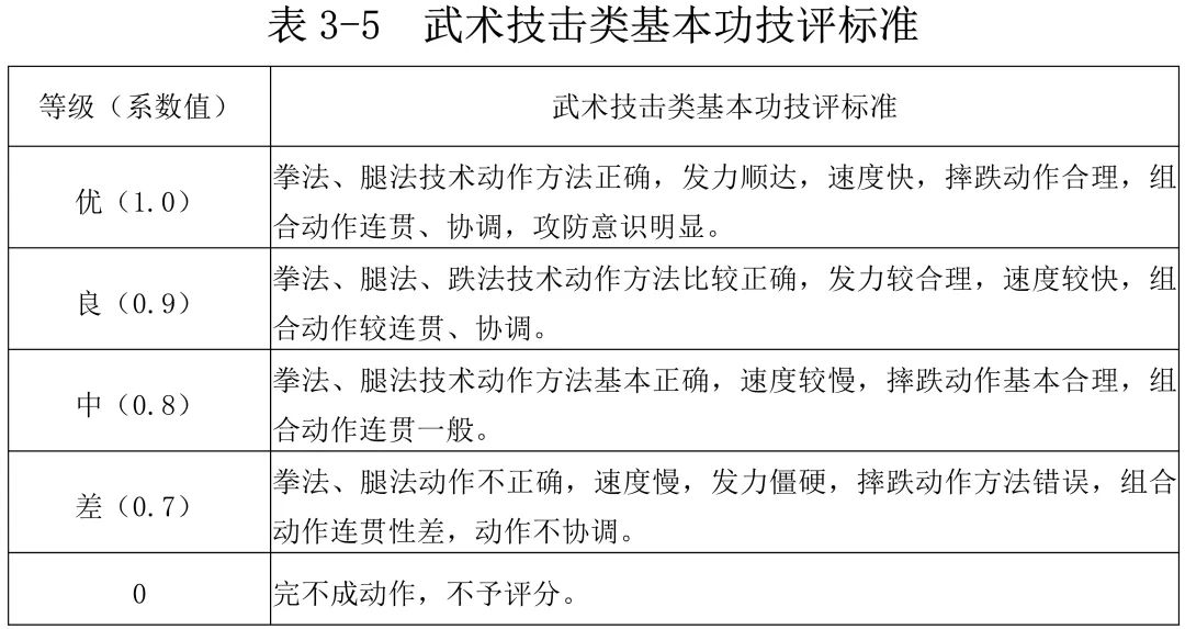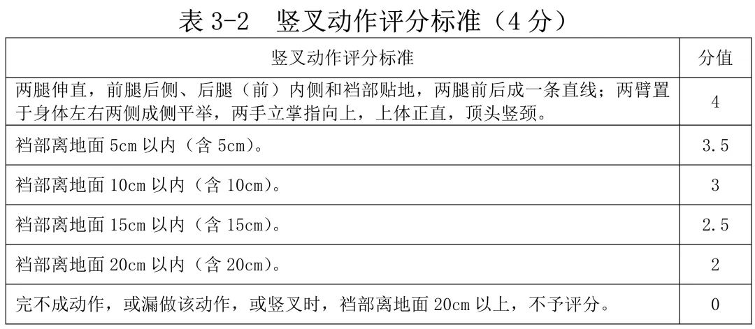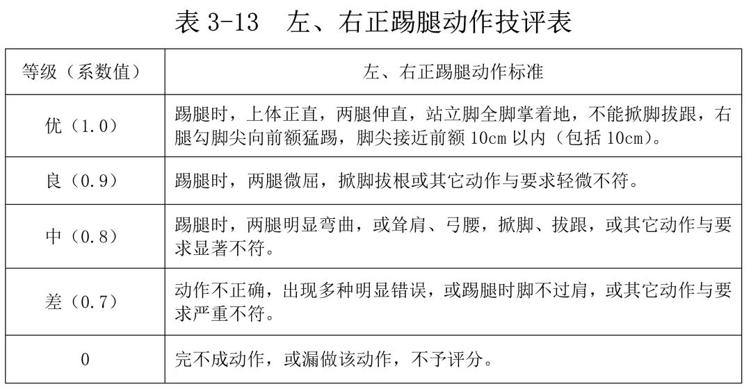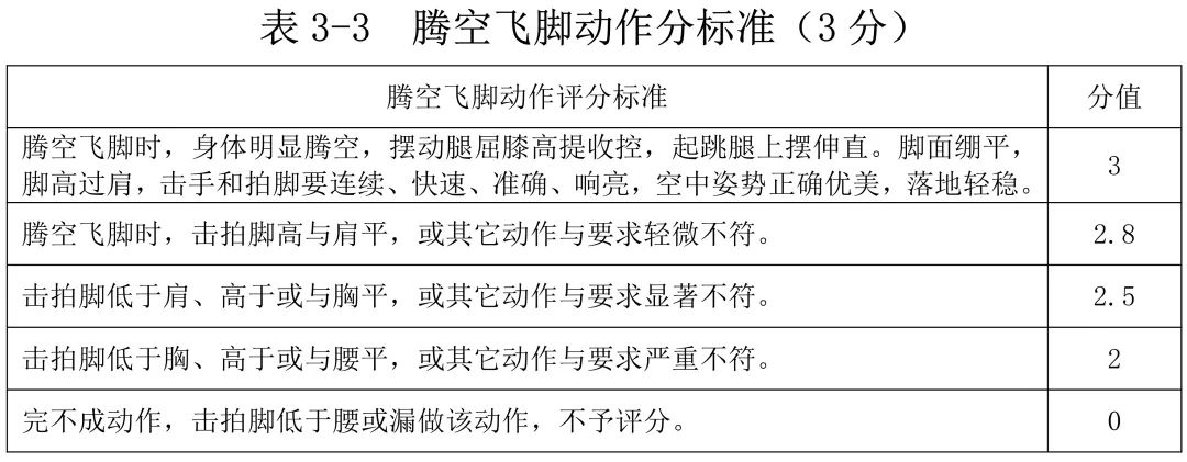 c.动作完成的前提下,对动作进行技评打分。技评针对每个完成的动作进行评定,评分标准见(表3-9-2)。