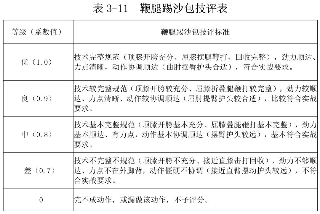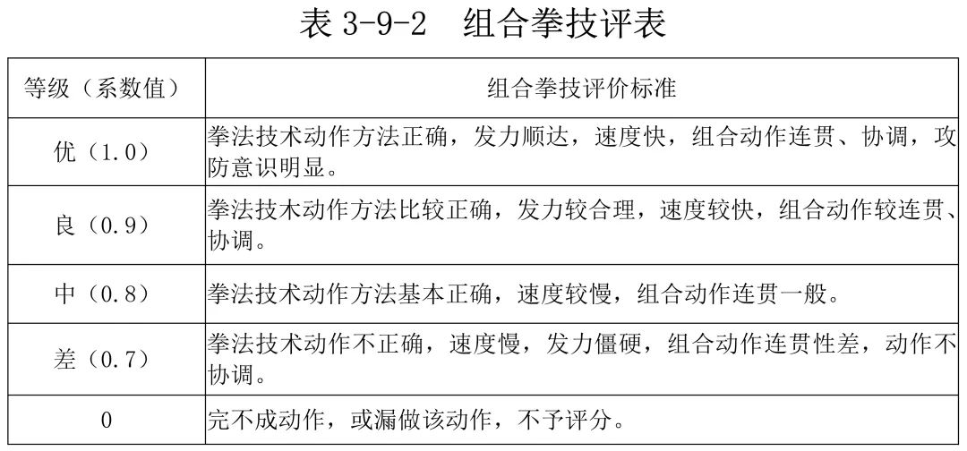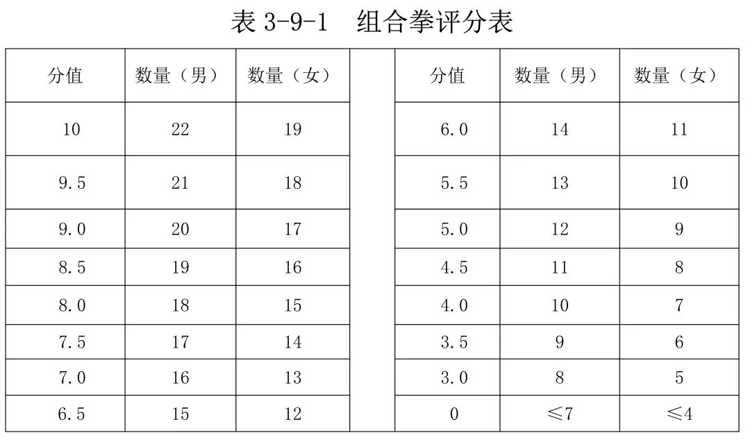 a.考试方法:考生从下列备选的组合拳(表3-8)中选择其中1组进行考试。考生对考评员指定的沙包进行击打,时间为20秒。要求考生击打沙包时技术动作规范、协调,节奏感强,出拳准确有力,每击打一组后需后撤一步再进行下一组的击打,符合考试要求的拳法组合,方被视为有效。对考生在规定时间内完成的有效组数进行计数,无效拳法组合不予计数,评分标准见(表3-9-1)。
