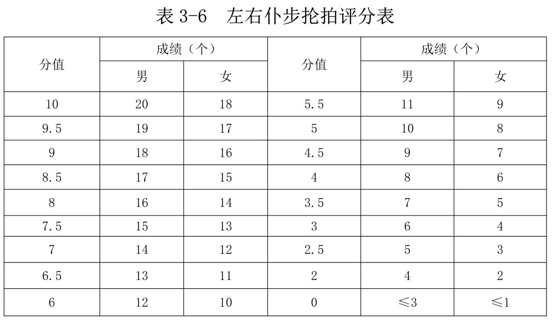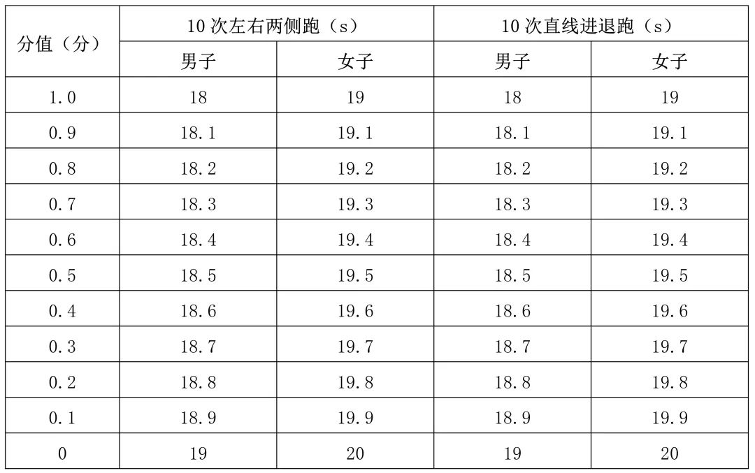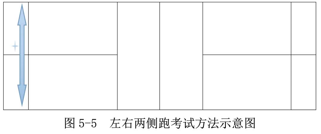 在6米宽的场地两侧分别设置标志物,考生听到口令起跑,同时开表计时。考生在6米宽的场地内左右移动并须用手将地面标志物击倒,往返10次停表。每人测试2次,取其中最好成绩。