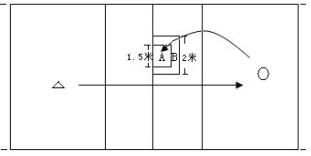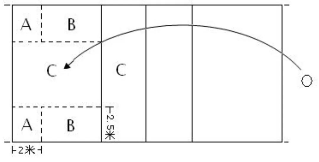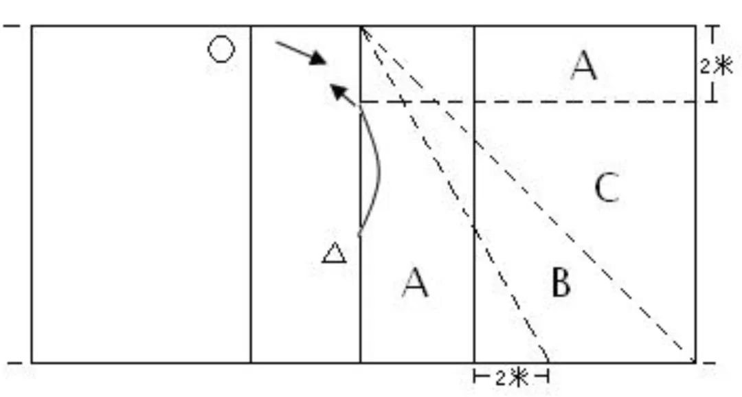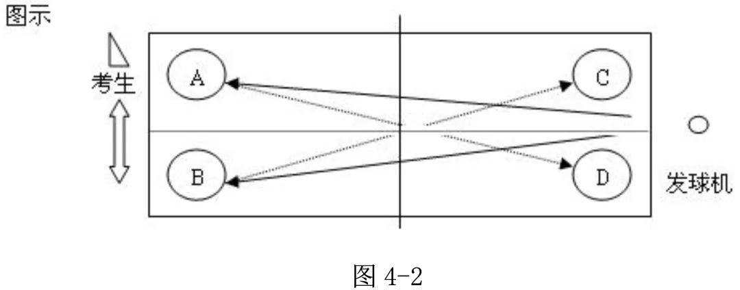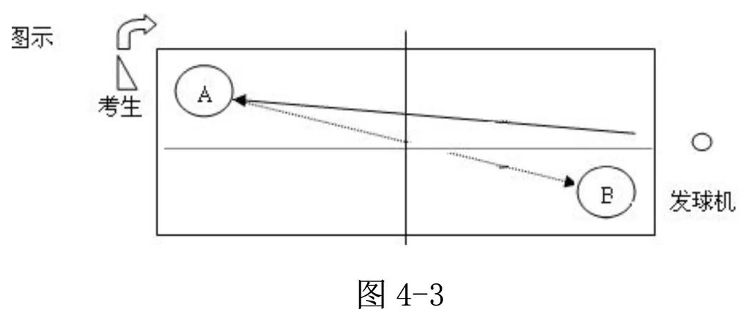 如图所示。由二传在3号位传球,考生在4号位自己给一传后助跑起跳扣球,连续扣球10次。要求扣球有一定力量,力量较小的轻拍扣球,则在相应得分中扣去0.3分。