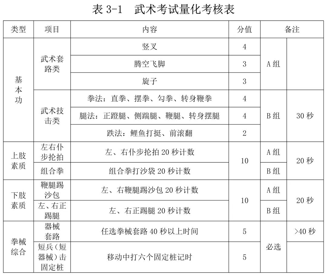 武术考试项目的主要内容为基本功、上肢素质、下肢素质和拳械综合,各项内容的分值各为10分,四项最后得分相加为武术专项的最后得分(单项最后得分=单项量化得分×单项技评系数值)。其中前三项内容都有A、B两组,任选一组动作测试,只能选择一次,第四项为必选项。(见表3-1)
