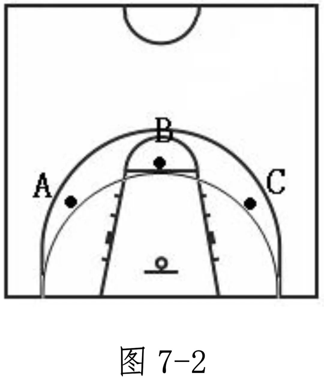 以篮球投影中心为圆心,以该点到罚球线的距离为半径,划一圆弧。开始时考生在弧线处作跳投,并开始计时;投篮后自己抢篮板球,再运至弧线外再跳投,连续做一分钟(女生投篮可做定位投,也可以做跳投)。(见图7-2)
