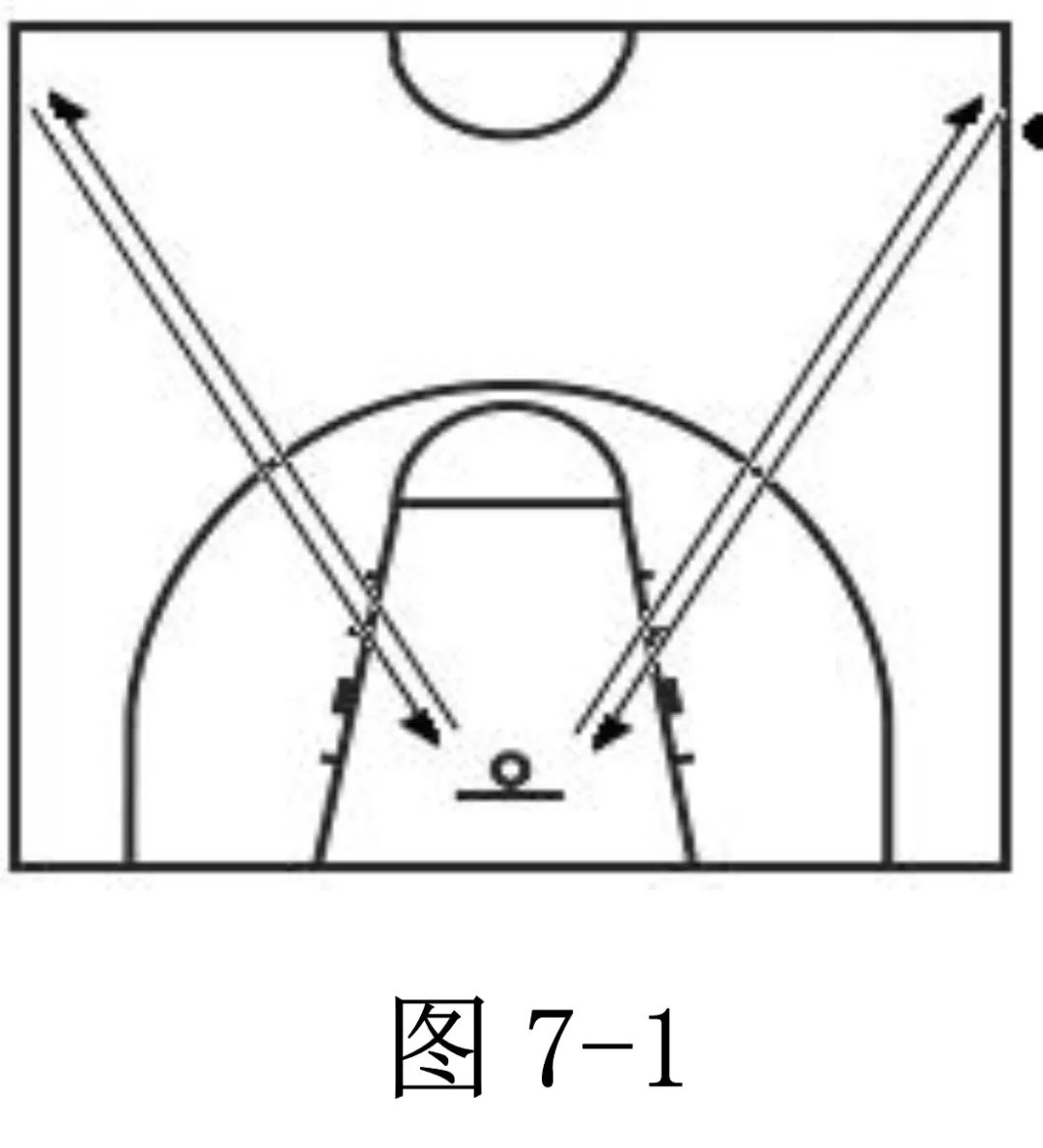 由球场右侧边线中点开始,面向球篮以右手运球上篮,同时开始计时;球投中篮后,还以右手运至左侧边线中点;然后折转换左手运球上篮;投中篮后,还以左手运球回到原起点;同样再重复上述运球投篮一次,再回到原起点时停表(见图7-1)。