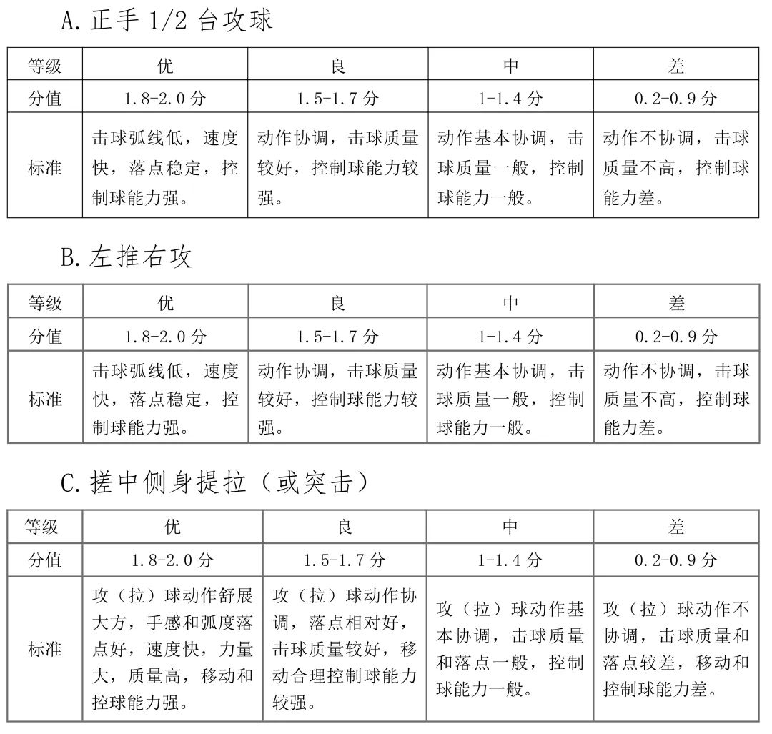 考生可根据自己的实际技术水平,从两组组合动作中选择一种组合进行测试。考评员根据考生所选组合动作的难易程度和完成该组合动作的质量级别进行评分。