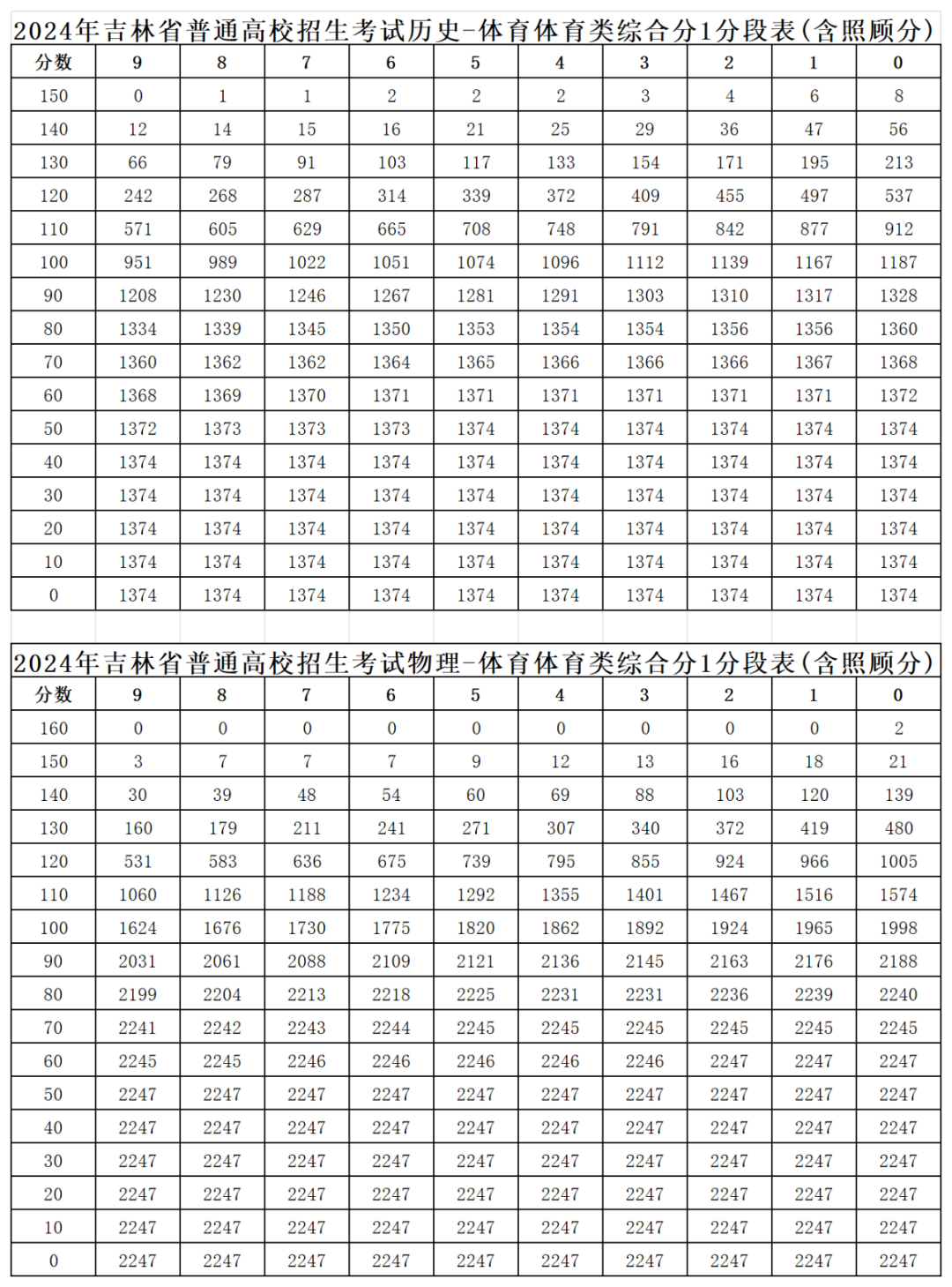 2024年吉林省普通高校招生考试体育类综合成绩一分段表