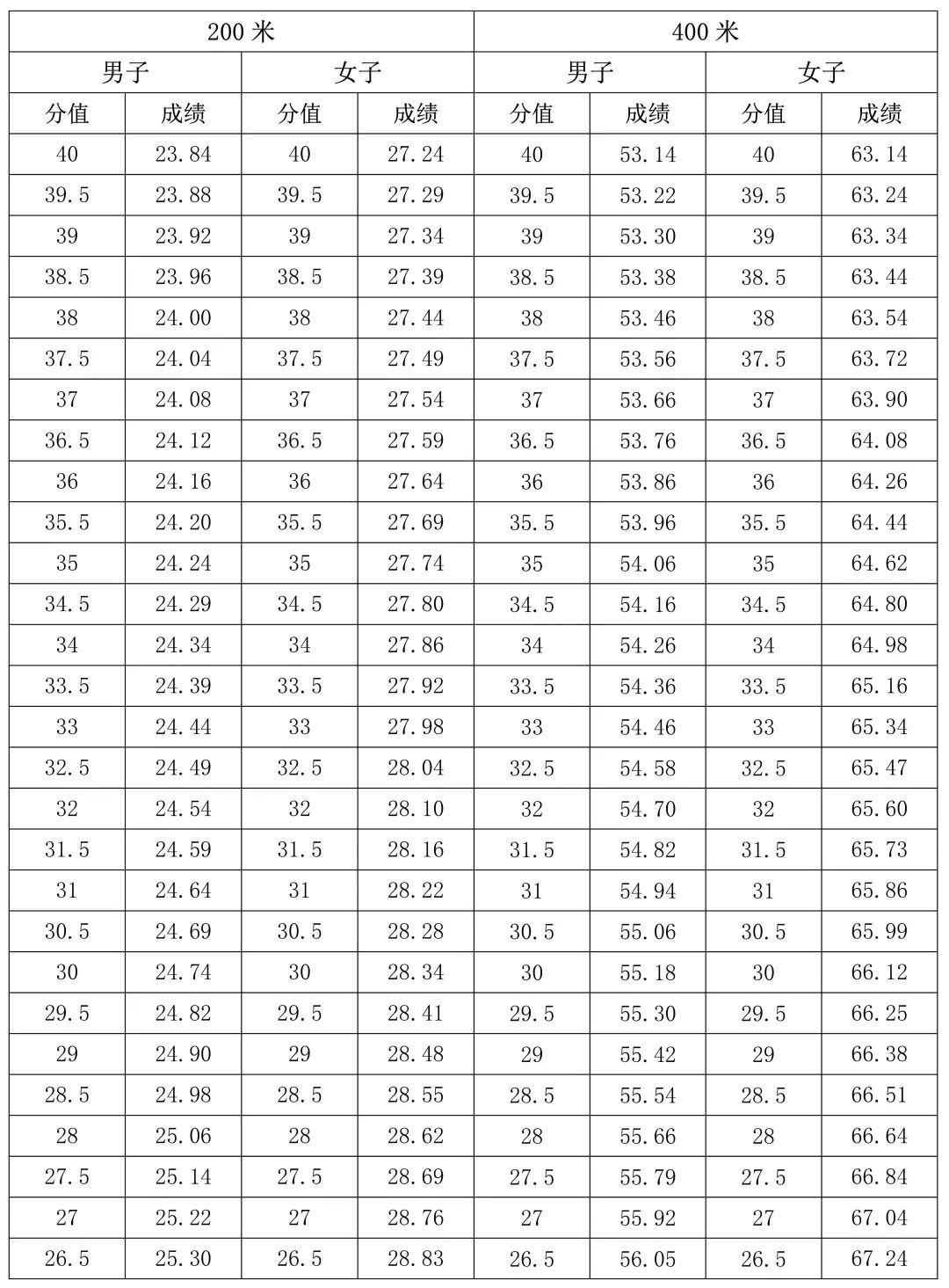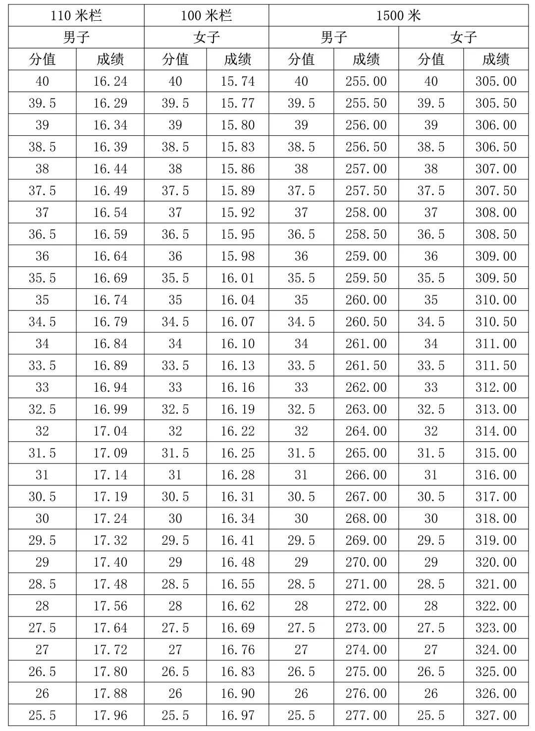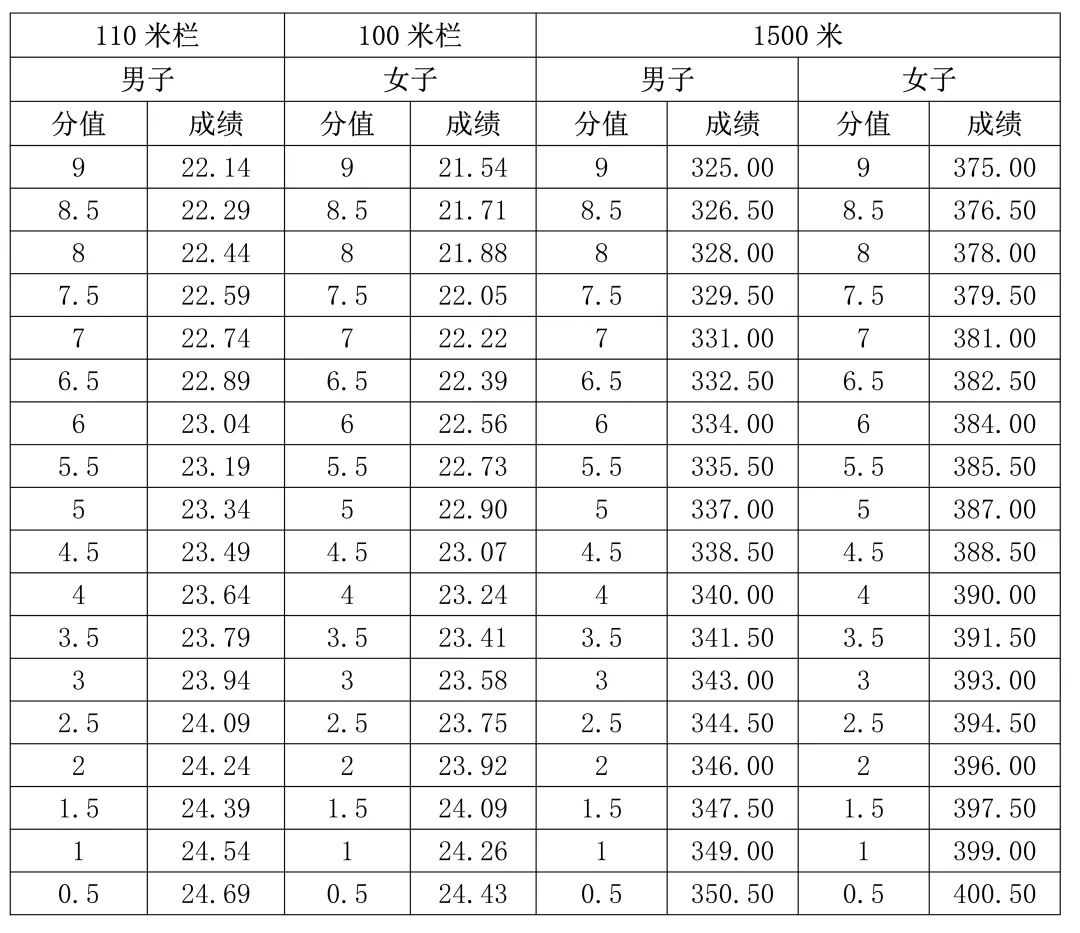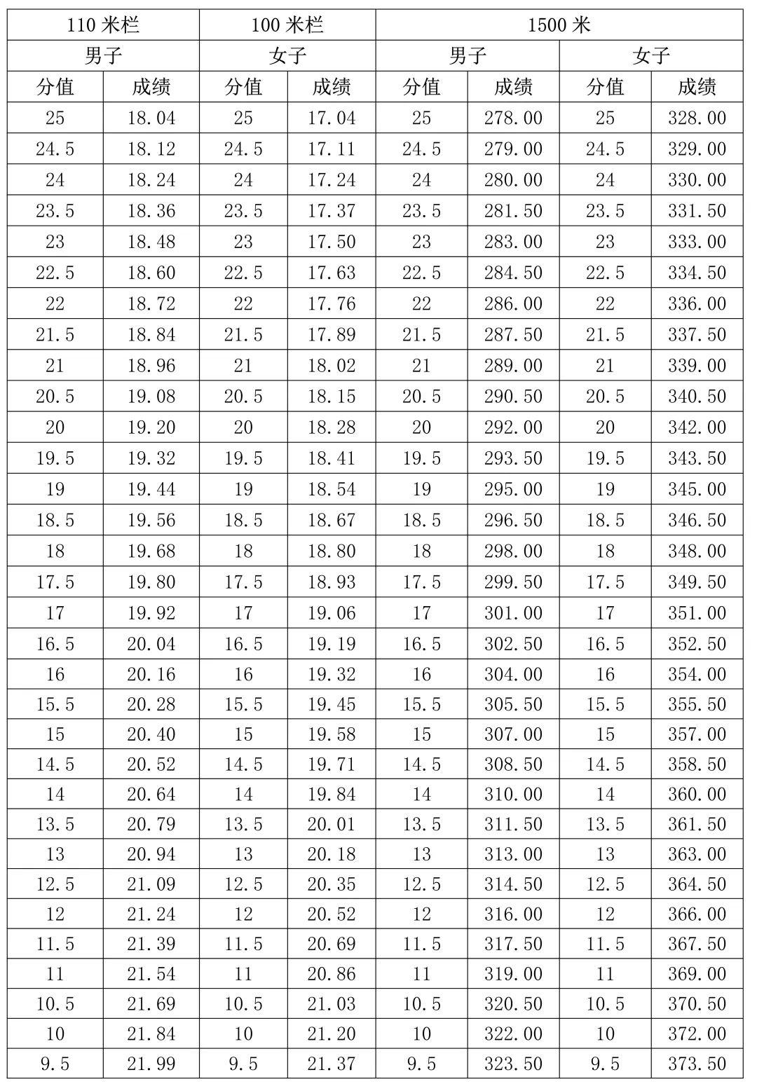 2.男子110米栏、女子100米栏、1500米跑评分表(单位:秒)