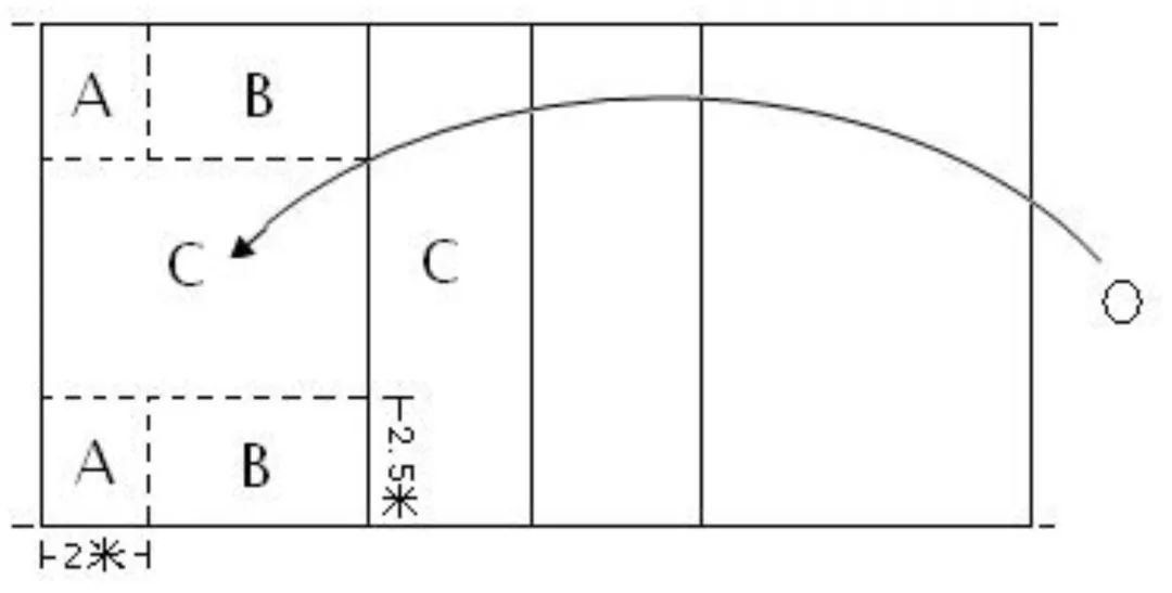 如图所示。教师在对方场区侧手发球,考生在后场区6号位接10个发球。要求垫球弧度不低于球网,若球的飞行弧度低于球网上沿,则在相应得分中扣去0.3分。
