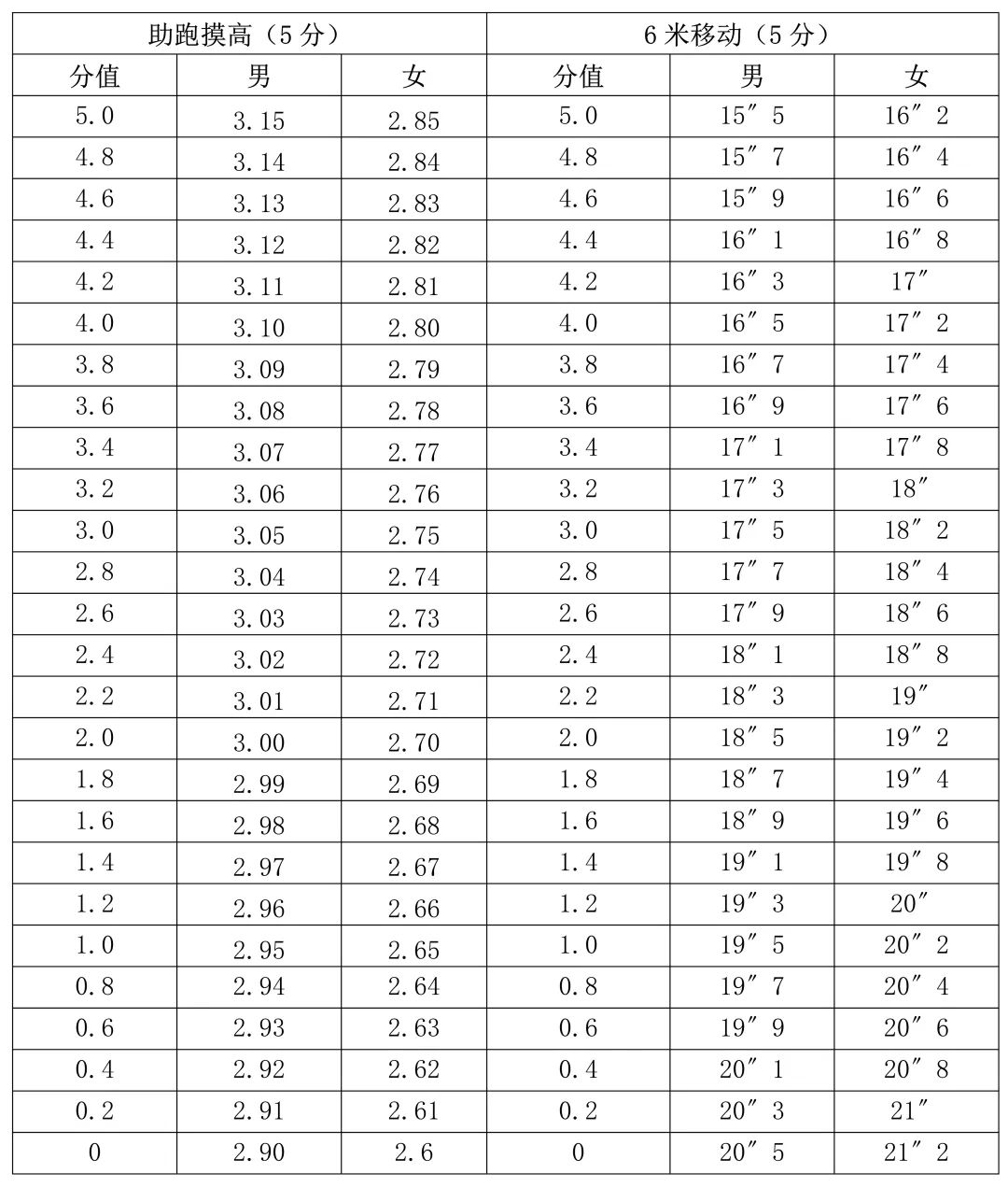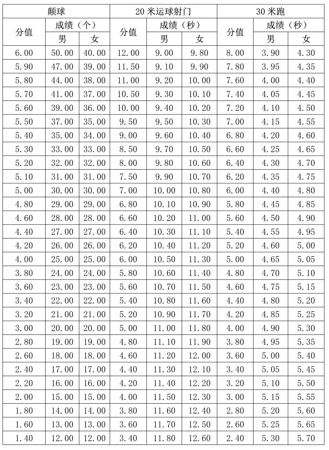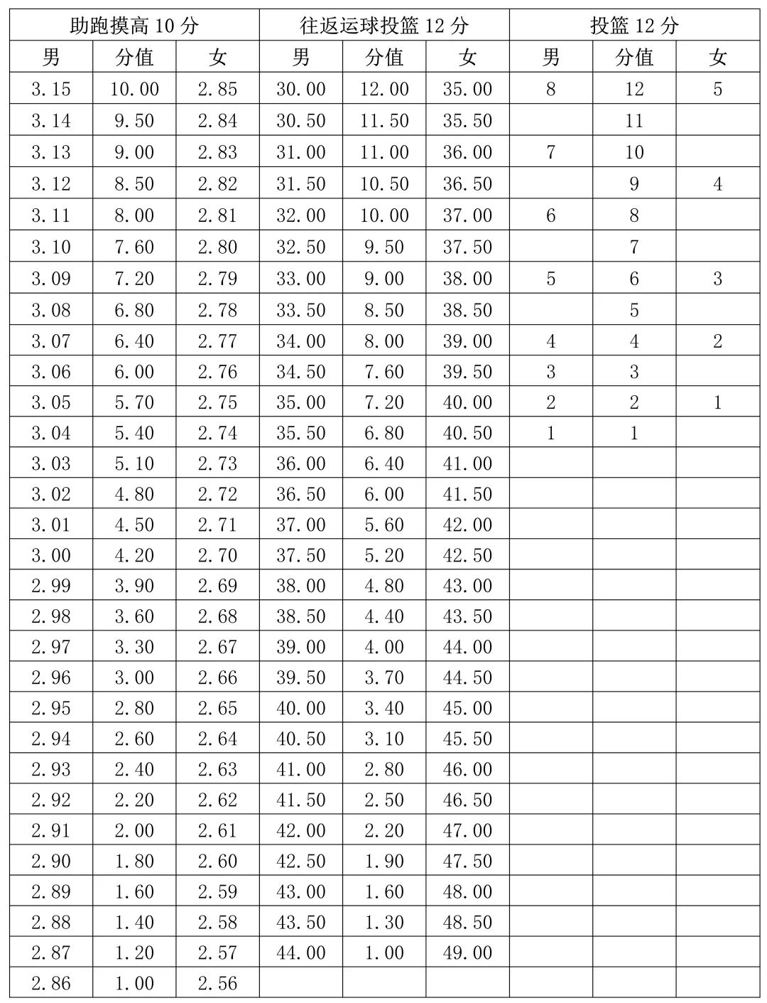 专项素质满分为12分。每项测验内容达到要求者可得评分表规定的满分。达不到要求者视其情况扣分。其中达标项目评分标准为: