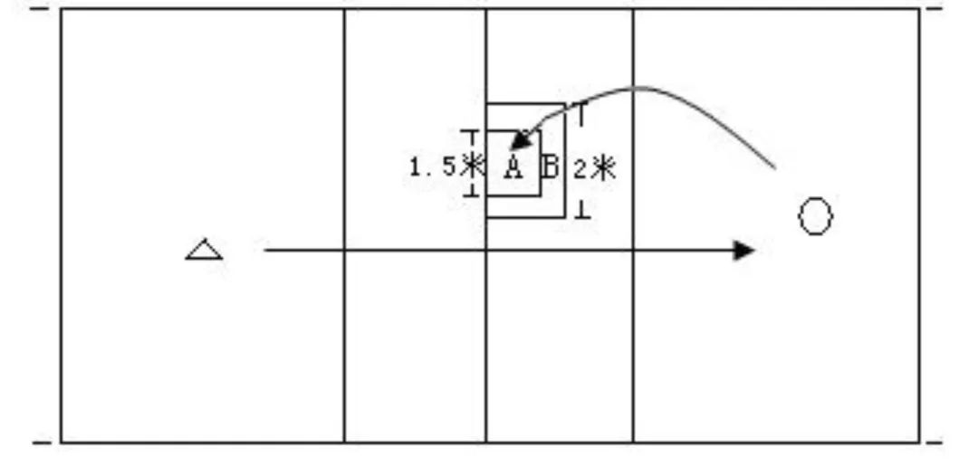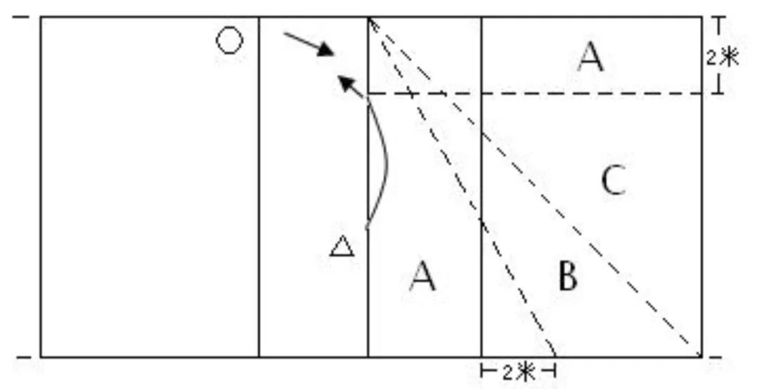 如图所示。由二传在3号位传球,考生在4号位自己给一传后助跑起跳扣球,连续扣球10次。要求扣球有一定力量,力量较小的轻拍扣球,则在相应得分中扣去0.3分。