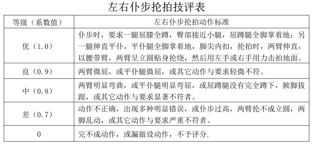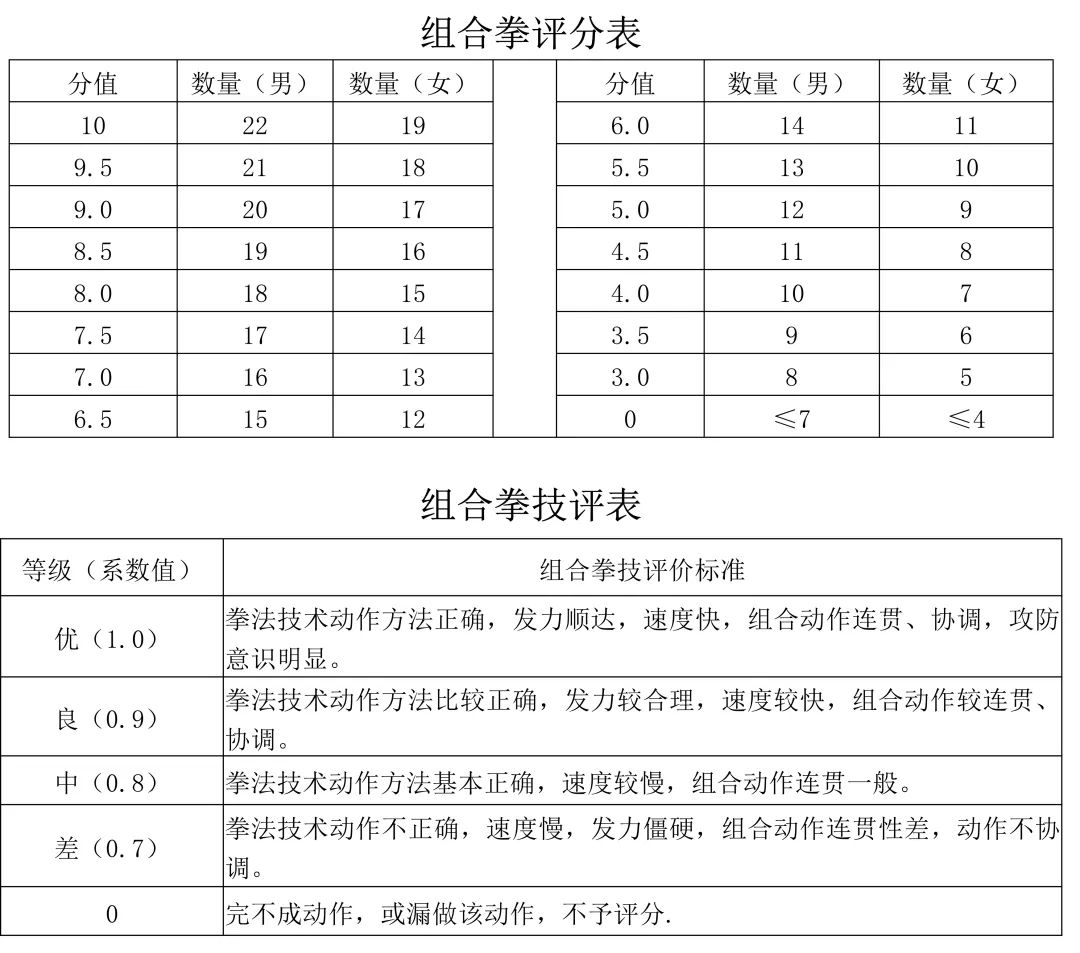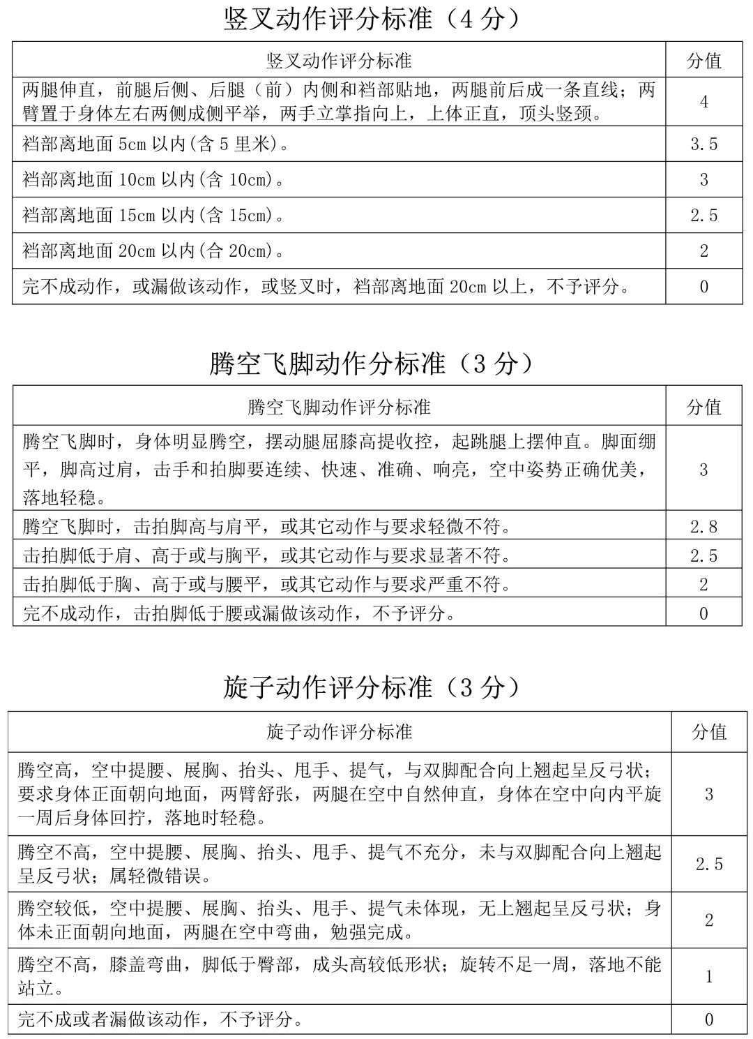 a.姿势正确,方法清楚;身体协调,劲力顺达,力点准确;精神贯注,节奏分明;内容充实,风格突出者,不扣分;b.与要求轻微不符者,扣0.1-1分;c.与要求显著不符者,扣1.1-2分;d.与要求严重不符者,扣2.1-3分;e.完不成动作中途退场者,不于评分;f.完成套路的时间不足40秒(太极拳不足1分30秒),每少0.1秒至2秒扣0.1分,每少2.1秒至4秒扣0.2分,依此类推。