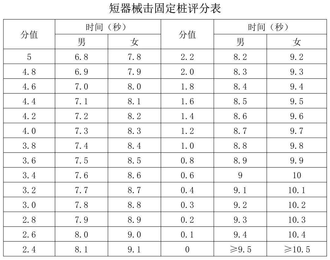 a.用器械(短兵)全长90cm,打六个固定桩(桩高170cm、直径40cm)。固定桩分成两排,一排三个,两排距离4米,每两个相邻桩距离2米,成“Z”字形排列。每个桩分别打头、躯干、大腿三个固定点。考生站在出发台前,前脚踏住计时启动器,准备好后听口令自己启动计时器,按顺序打完三个桩的固定点后,自己停计时器,回到出发台。所用时间换算成分数就是考生的最终分数,每个考生考2次,取最好成绩。考生打桩所用的移动方法不限,漏掉任意一个点扣1分,依次递减,直至清零,得分标准和考试方法见下表。