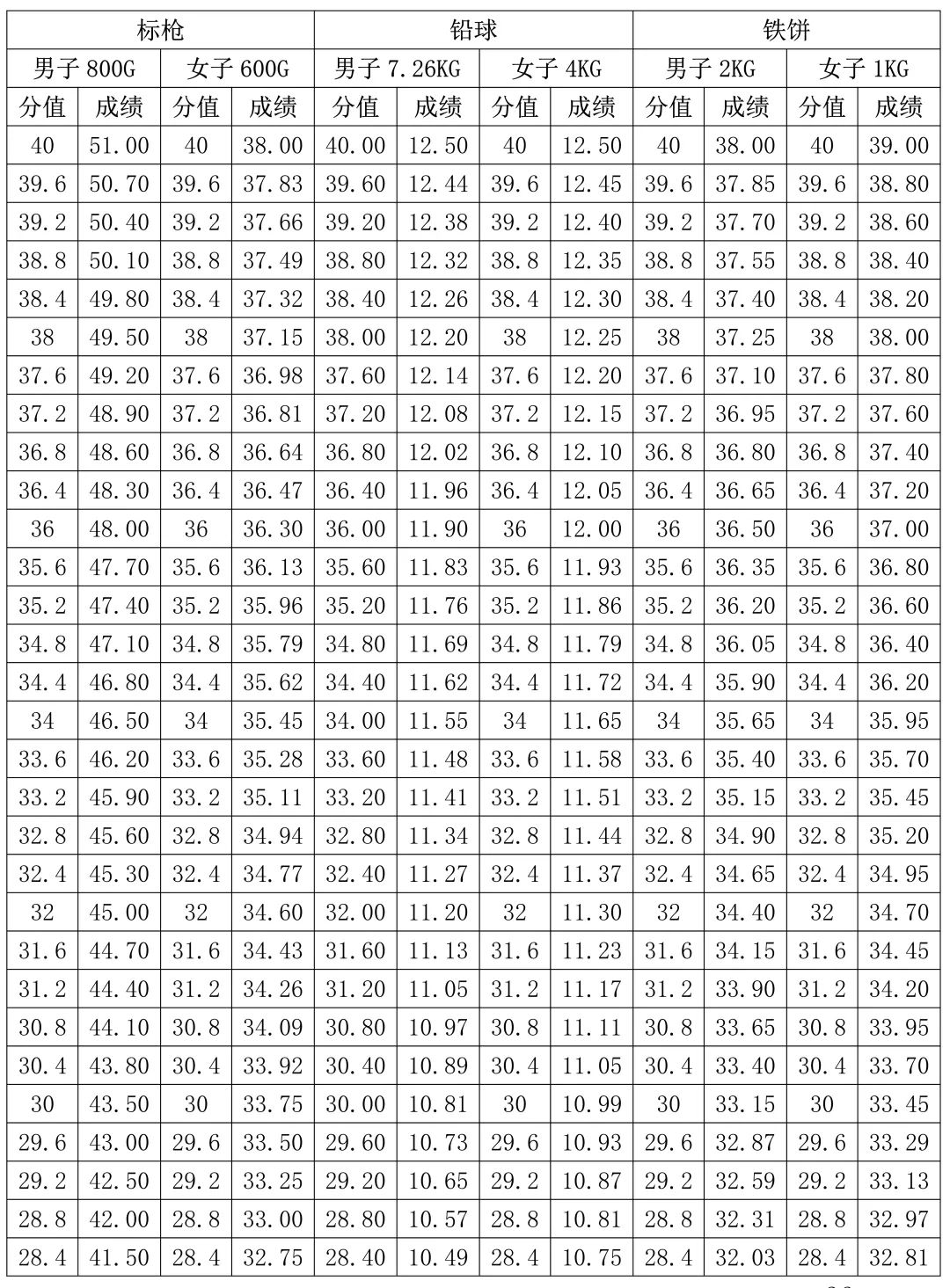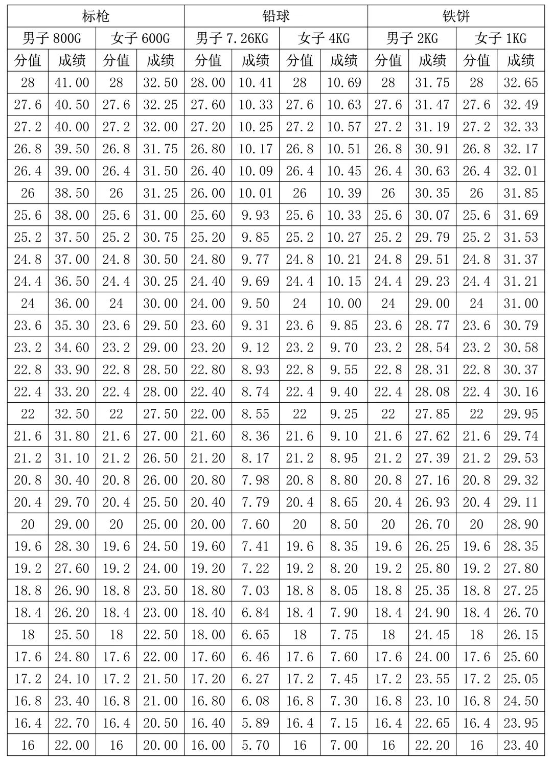 4.标枪、铅球、铁饼专项评分表(单位:米)