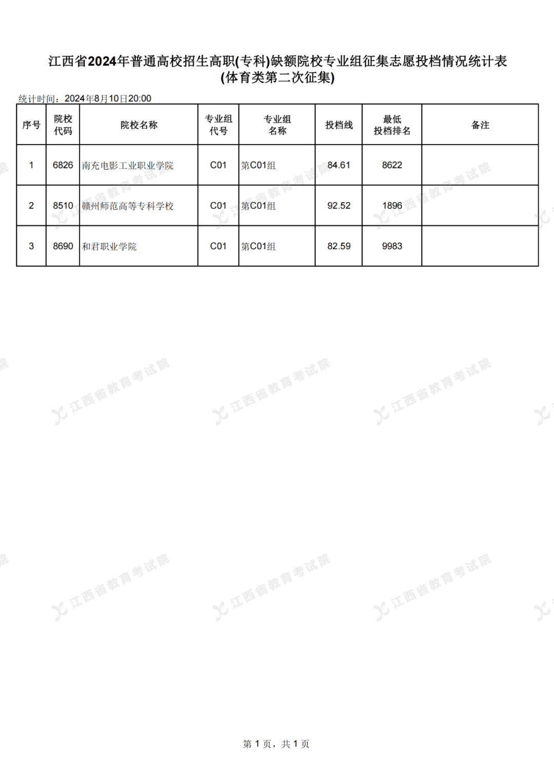 江西省2024年普通高校招生高职(专科)缺额院校专业组征集志愿投档情况统计表(体育类第二次征集)