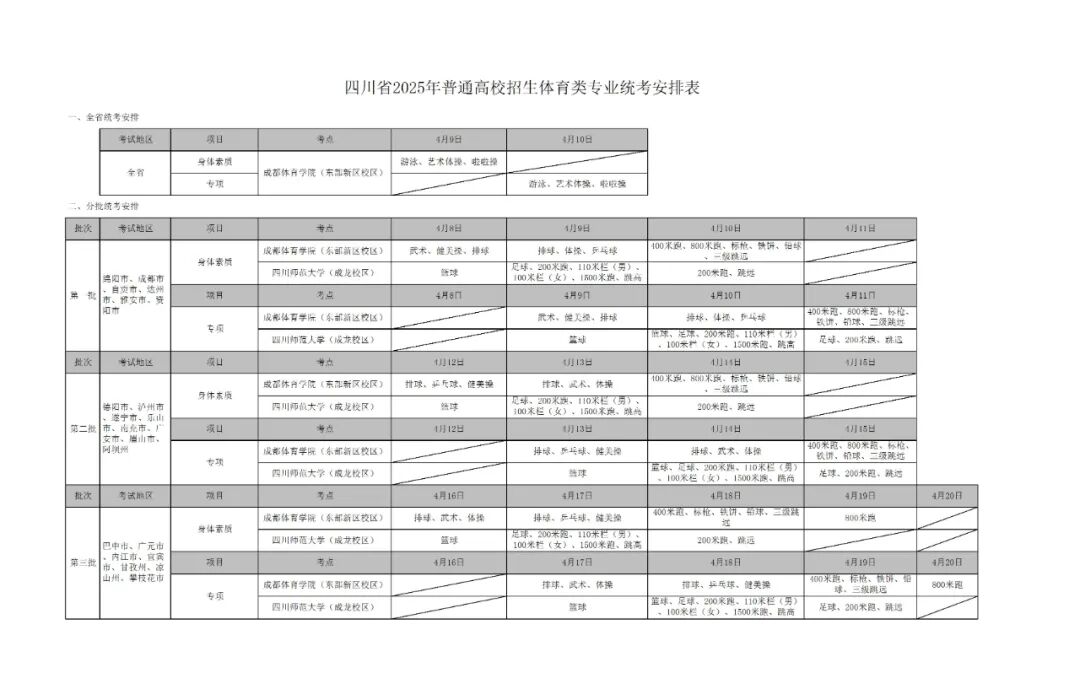 四川省2025年普通高校招生体育类专业统考(以下简称体育类专业统考)将于4月8日至20日分别在成都体育学院(东部新区校区)考点(地址:成都市东部新区环湖北路1942号)和四川师范大学(成龙校区)考点(地址:成都市成龙大道二段1819号)举行,现将考试相关事项公告如下。成都体育学院(东部新区校区)考点将进行排球、武术、游泳、艺术体操、健美操、啦啦操、体操、乒乓球、田径〔400米跑、800米跑、三级跳远(男)、铅球、铁饼、标枪〕项目的专业考试。四川师范大学(成龙校区)考点将进行足球、篮球、田径〔200米跑、1500米跑、110米栏(男)、100米栏(女)、跳高、跳远〕项目的专业考试。考生可于4月1日9:00起至考试结束,在四川省教育考试院普通高考报名系统(https://gkbm.sceea.cn)自行打印本人的专业准考证,并按照准考证上的时间安排参加考试。考生按准考证上的检录(点名)时间提前30分钟进入考点候考。检录时,必须出示本人准考证及居民身份证原件,身份验证通过后方可参加考试。注意:考试场地及周边实行封闭式管理,考生独立应考,除考生本人外,其他人员不得进入考点。考试相关事宜将在考点微信公众号上公布,请考生关注本人所在考点的微信公众号。附件:四川省2025年普通高校招生体育类专业统考安排表