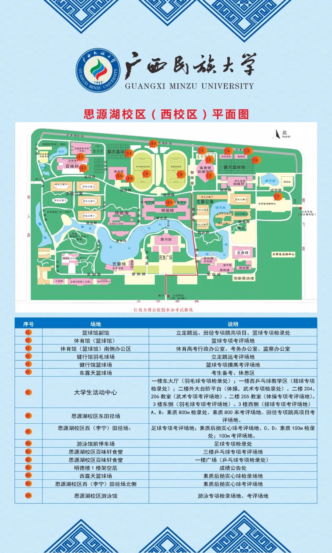 (一)广西民族大学思源湖校区(西校区),地址:南宁市大学西路158号。考试期间考生可凭准考证和身份证、领队老师凭工作证进入考点,仅可通过学校南门进出考点。