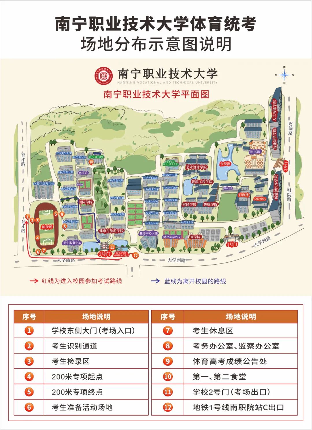 (三)南宁职业技术大学,地址:南宁市大学西路169号。考试期间考生可凭准考证和身份证、领队老师凭工作证进入考点,从学校东门进入考点,由2号门离开考点。