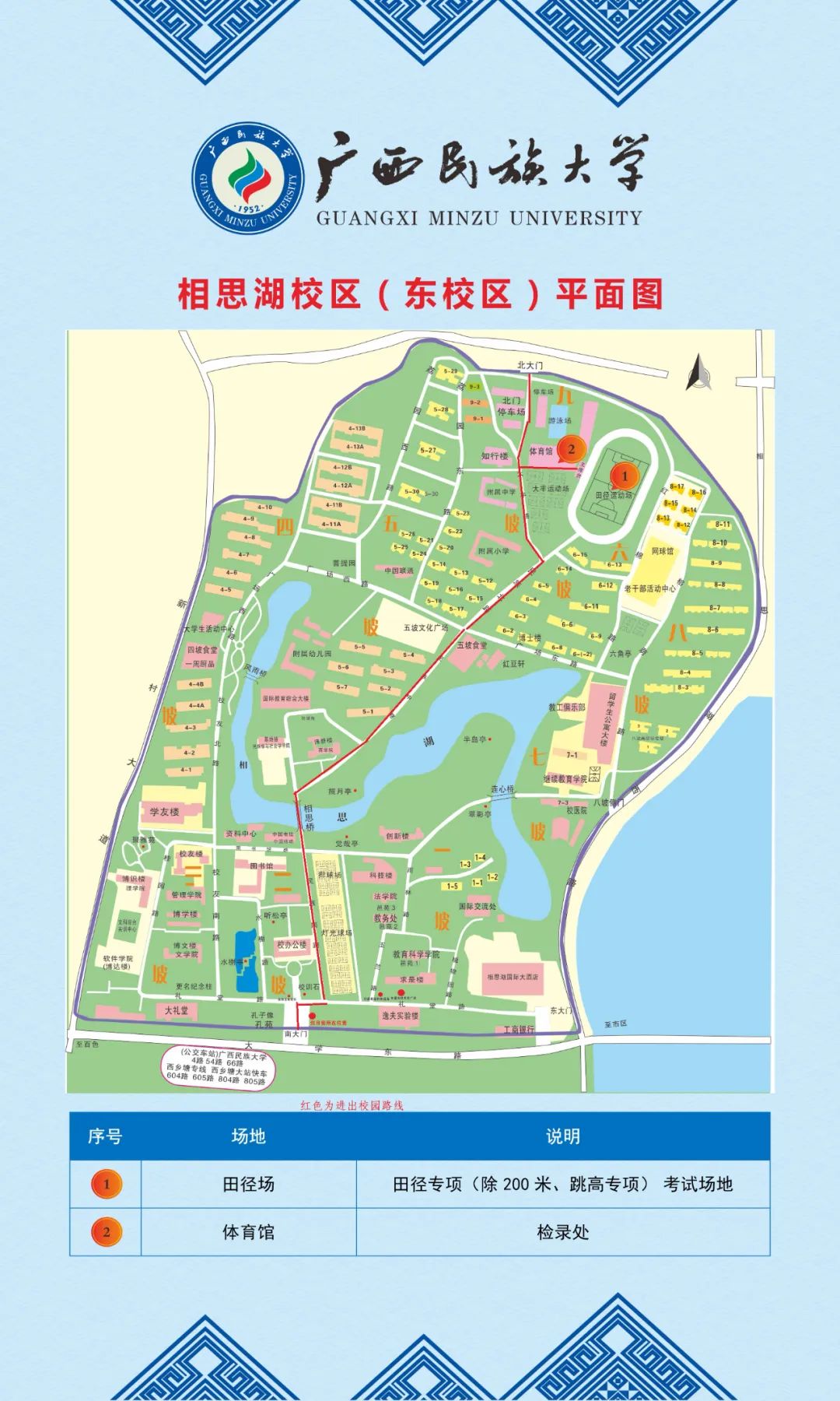 (二)广西民族大学相思湖校区(东校区),地址:南宁市大学东路188号。考试期间考生可凭准考证和身份证、领队老师凭工作证进入考点,可通过学校南大门或北大门进出考点。