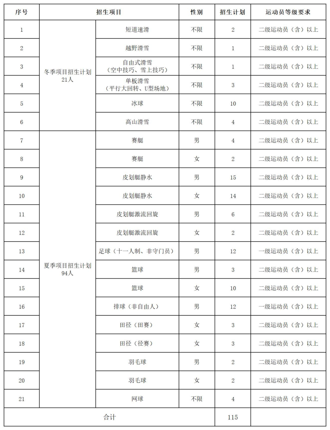 报考结束后,当招生项目公布计划数大于该招生项目一、二志愿报名人数总和时,将招生项目计划数与报考该项目人数之差作为剩余计划,调整到其他招生项目中。1.增调计划招生项目不包含公布计划数大于该项目一、二志愿报名人数总和的招生项目。(1)冬季项目计划调整顺序:①高山滑雪;②冰球;③越野滑雪。冬季项目剩余计划优先调入高山滑雪项目(最多调整至与高山滑雪项目报名人数相等)。调整后如仍有剩余计划时,再调入冰球项目(最多调整至与冰球项目报名人数相等)。调整后再次剩余计划时,调入越野滑雪项目(最多调整至与越野滑雪项目报名人数相等)。(2)夏季项目计划调整顺序:①皮划艇静水(女);②皮划艇静水(男);③排球(非自由人、男)。项目调整计划数=拟增调项目报名人数/(皮划艇静水(女)报名人数+皮划艇静水(男)报名人数+排球(非自由人、男)报名人数)×剩余计划数,结果只截取整数位。按照此公式调整计划后,仍有剩余计划时,按照皮划艇静水(女)、皮划艇静水(男)、排球(非自由人、男)顺序依次加一个计划,依次循环,加完为止。3.当以上优先增调计划的招生项目均存在公布计划数大于该招生项目一、二志愿报名人数总和时,调整计划规则为:分别在冬季项目范围内、夏季项目范围内进行调整,冬季项目与夏季项目间不做调整;调整计划数=“增调计划招生项目”报名人数/所有“增调计划招生项目”报名总人数×剩余计划数,结果只截取整数位。按照此公式调整计划后,仍有剩余计划时,按照增调计划招生项目报名人数由高到低依次加一个计划,依次循环,加完为止。1.符合2025年普通高等学校招生考试(以下简称普通高考)报名条件,且已参加生源所在地省级招生考试机构组织的普通高考报名(具体按各省级招生考试机构要求执行)。2.具备《2025年普通高等学校运动训练、武术与民族传统体育专业招生管理办法》(以下简称《管理办法》)所列运动训练、武术与民族传统体育专业招生项目的二级(含)以上运动员技术等级称号。考生运动员技术等级以“国家体育总局运动员技术等级系统”公示的数据信息为准。3.2025年报名考生的等级证书审批日期为:冬季项目为2015年1月1日至2025年1月7日;夏季项目为2015年1月1日至2025年3月10日。4.不在兴奋剂违规禁赛期内,以体育总局反兴奋剂中心核查结果为准。 1.考生在“中国运动文化教育网(www.ydyeducation.com)或“体教联盟APP”中“普通高等学校运动训练、武术与民族传统体育专业招生系统”(以下简称“体育单招系统”)进行注册(验证考生报名资格)并报名,具体时间如下:冬季项目注册时间为2024年12月19日12:00至2025年1月7日12:00。冬季项目报名时间为2024年12月29日12:00至2025年1月7日12:00。夏季项目注册时间为2025年2月1日12:00至3月10日12:00。夏季项目报名时间为2025年3月1日12:00至3月10日12:00。(1)考生应在规定时间内通过“体育单招系统”完成注册,校验运动员技术等级信息,已完成注册的考生应通过“体育单招系统”签订《反兴奋剂承诺书》、填报志愿并缴纳考试费。拒不签订《反兴奋剂承诺书》的考生,视为主动放弃考试资格。考生完成缴费视为报名成功,完成缴费后,考生不得再对报名信息进行修改。(2)考生依据体育专项考试的收费标准和生源所在省级招生考试机构文化考试收费标准,在线缴纳考试费。省级招生考试机构对考生生源地信息进行审核,考生生源地如有变化,考生应根据审核后的生源所在地文化考试收费标准,办理文化考试费补缴或退费手续,未按规定时间补缴文化考试费的考生将被取消考试资格或录取资格。(3)考生在注册过程中,如发现本人运动员技术等级信息有误,应及时联系等级证书授予单位进行信息更正,确保在注册报名截止日期前完成报名。(4)考生本人的运动员技术等级项目应与报考招生项目一致,考生如具备所报考项目的多个运动员技术等级证书,报名时需填报所有符合报名要求的运动员技术等级证书。(5)考生报名不要超过两所学校,慎重编排所报院校志愿顺序。录取将依据报名填报志愿顺序,优先录取一志愿考生,我校在未完成招生计划的情况下,再录取二志愿考生。(6)此次网上填报的信息作为考生录取的基础信息,请考生一定要仔细填写,如因个人原因填写错误影响录取,由考生本人负责。所有考生必须参加高考报名所在地省级招生考试机构组织的文化考试。1.文化考试科目:语文、数学、政治、英语四科,每科满分为150分,四科满分为600分,使用国家通用语言文字作答。2.考生于2025年3月22日12:00后登录“体育单招系统”打印文化考试准考证。3.考生依据准考证上的考点信息于3月29日、30日参加文化考试。4.文化考试成绩查询时间:考生可于5月18日12:00后通过“体育单招系统”查询文化成绩,对成绩有疑议的考生可于5月18日12:00至19日12:00通过“体育单招系统”提交复核申请。1.体育专项考试分项目全国统考,体育总局科教司委托有关院校(以下简称组考院校)组织实施。考生可通过“中国运动文化教育网”“体教联盟APP”或组考院校官网,查询体育专项考试具体安排、考生须知等信息,按要求参加体育专项考试。2.体育专项考试满分100分,考试方法与评分标准按国家体育总局制定的《普通高等学校运动训练、武术与民族传统体育专业体育专项考试方法与评分标准(2025版)》执行。考生依据报