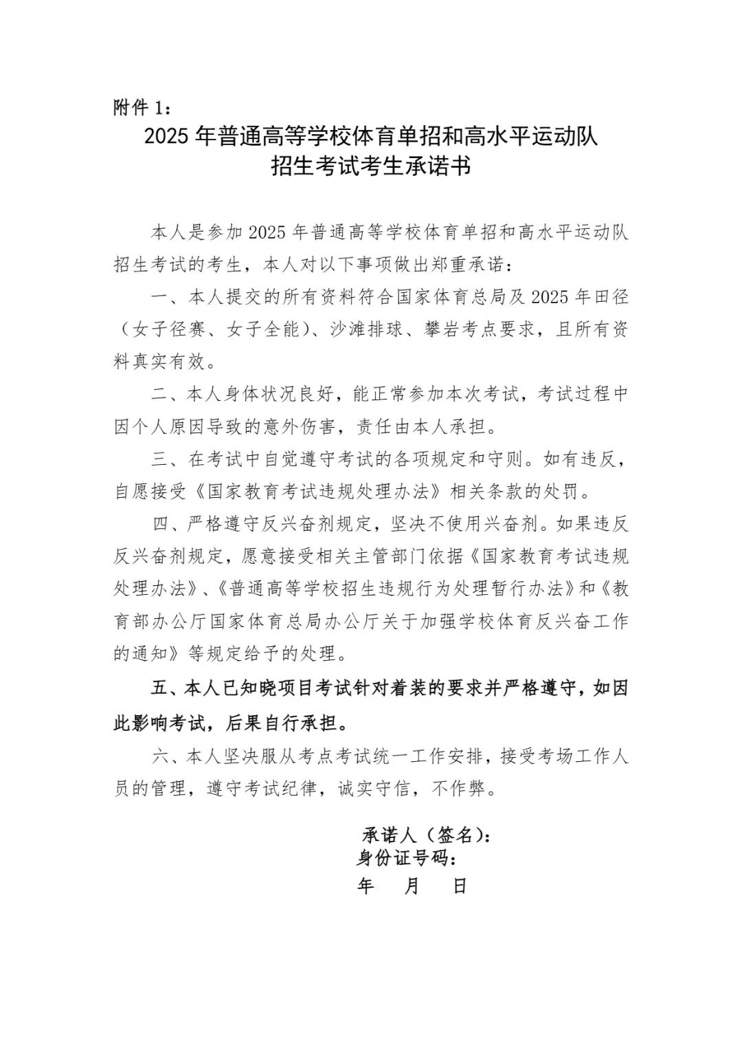 附件1:2025年普通高等学校体育单招和高水平运动队招生考试考生承诺书.pdf(注:点击文末阅读原文即可下载附件)