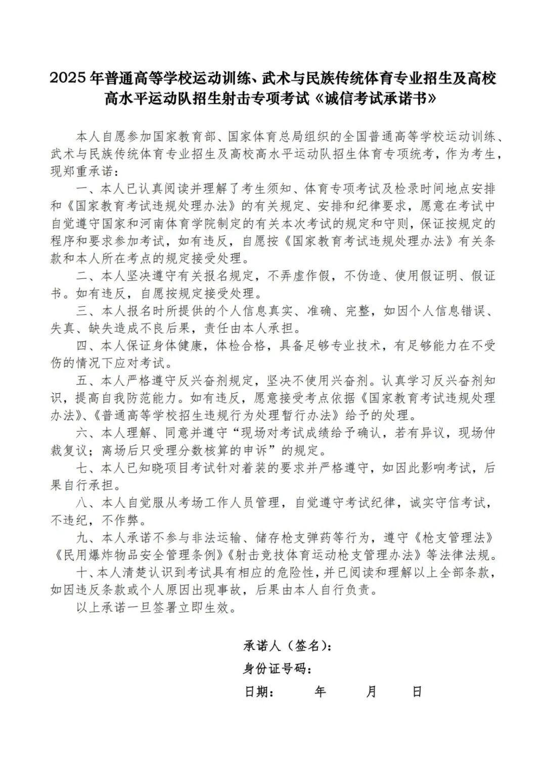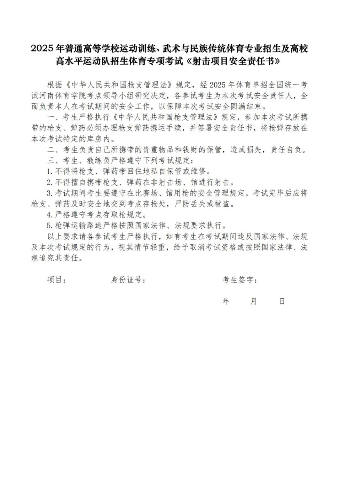 (六)考生自行下载、打印《诚信考试承诺书》、《射击项目安全责任书》(见附件1、2),认真阅读并签字,在现场确认处提交。