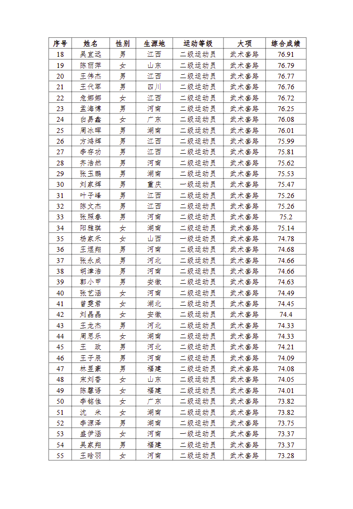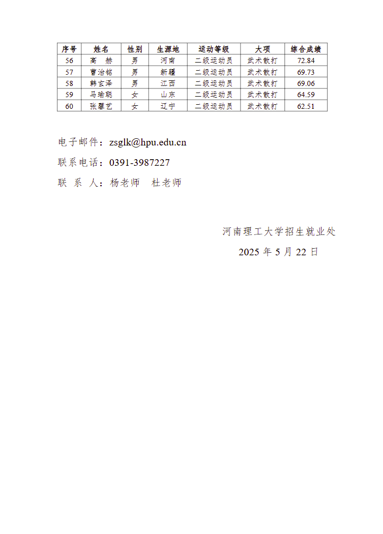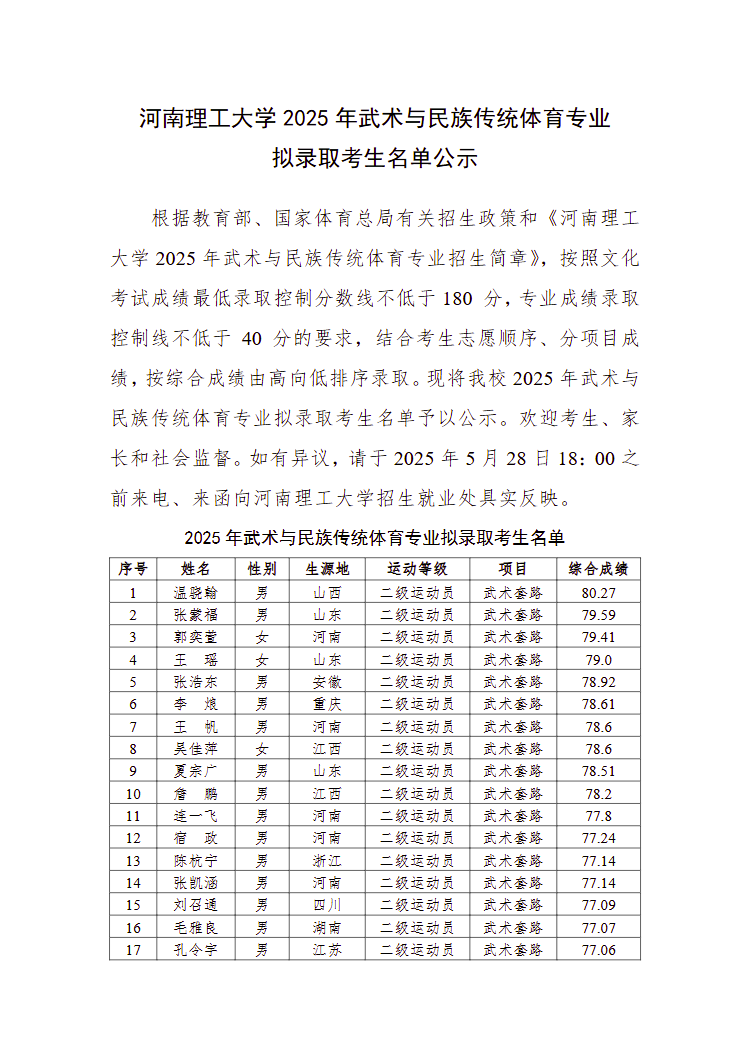 河南理工大学2025年武术与民族传统体育专业拟录取考生名单公示