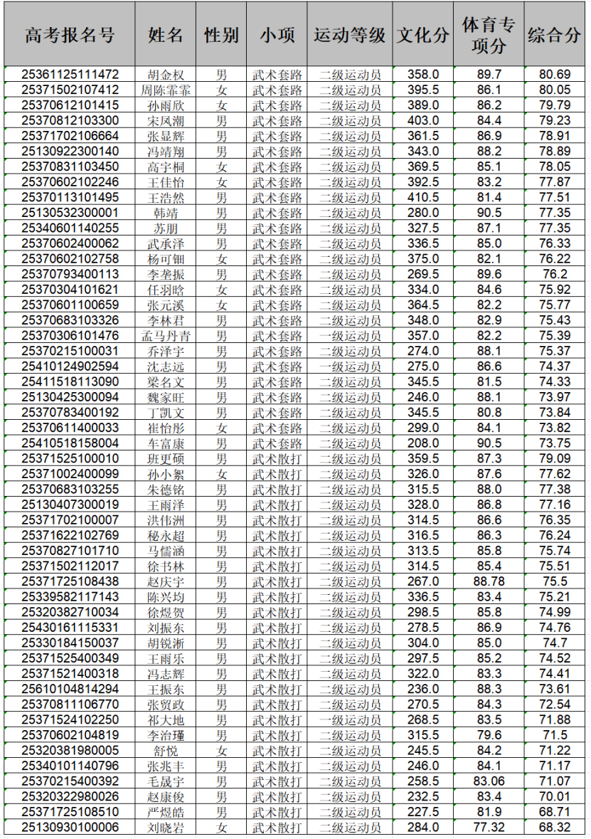 我校2025年武术与民族传统体育专业招生计划为50人,其中武术套路、武术散打各25人,第一志愿全部录满。现将拟录取名单进行公示如下