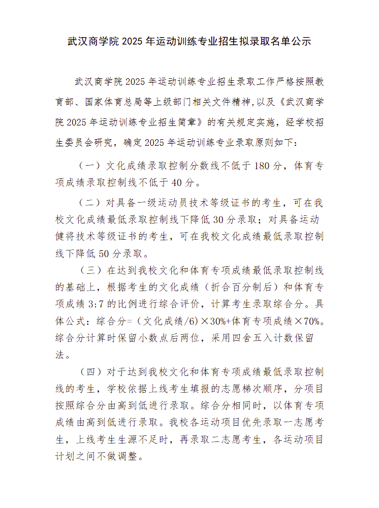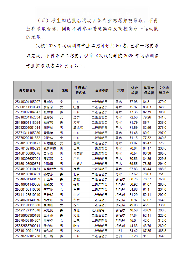 武汉商学院2025年运动训练专业招生拟录取名单公示