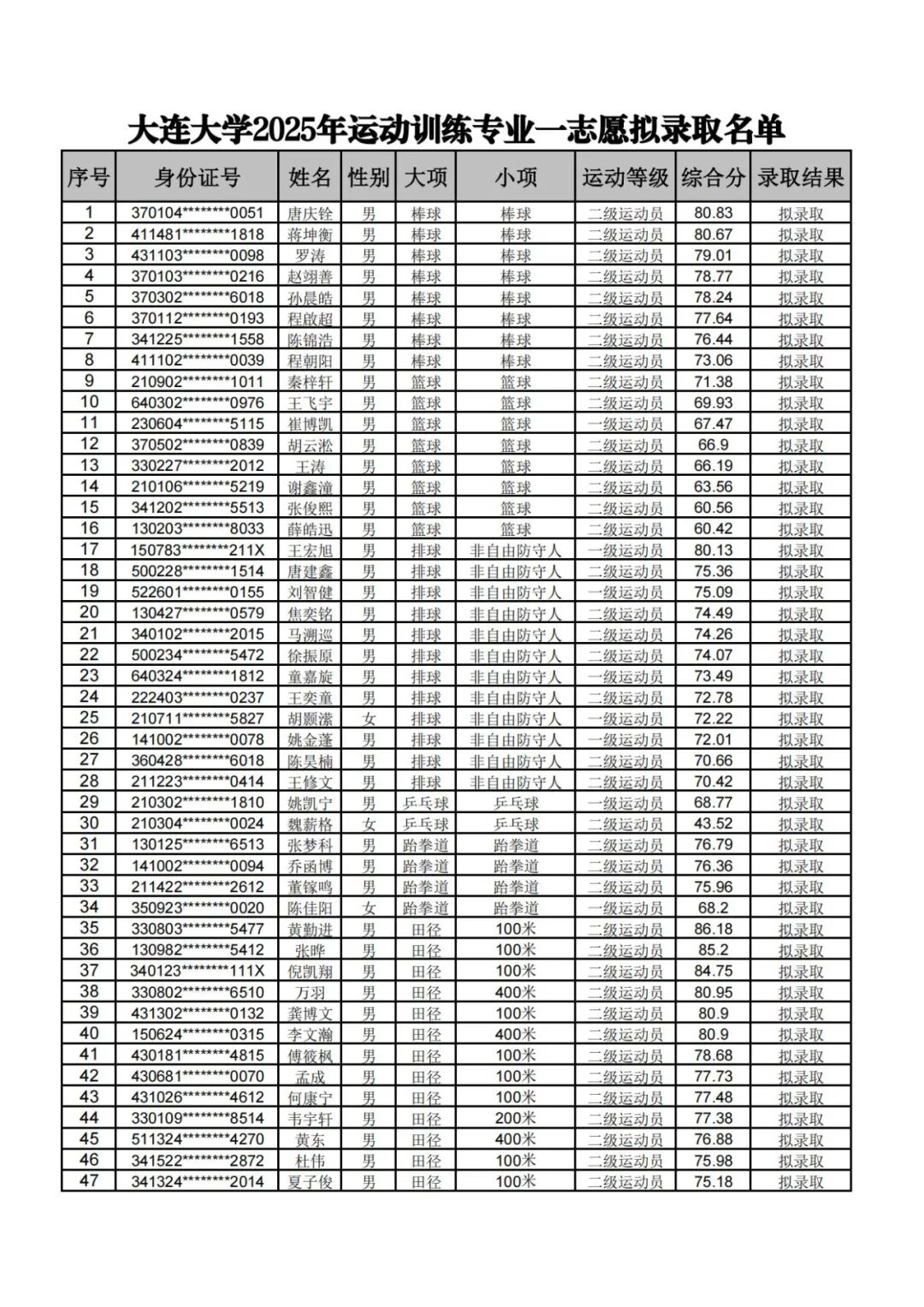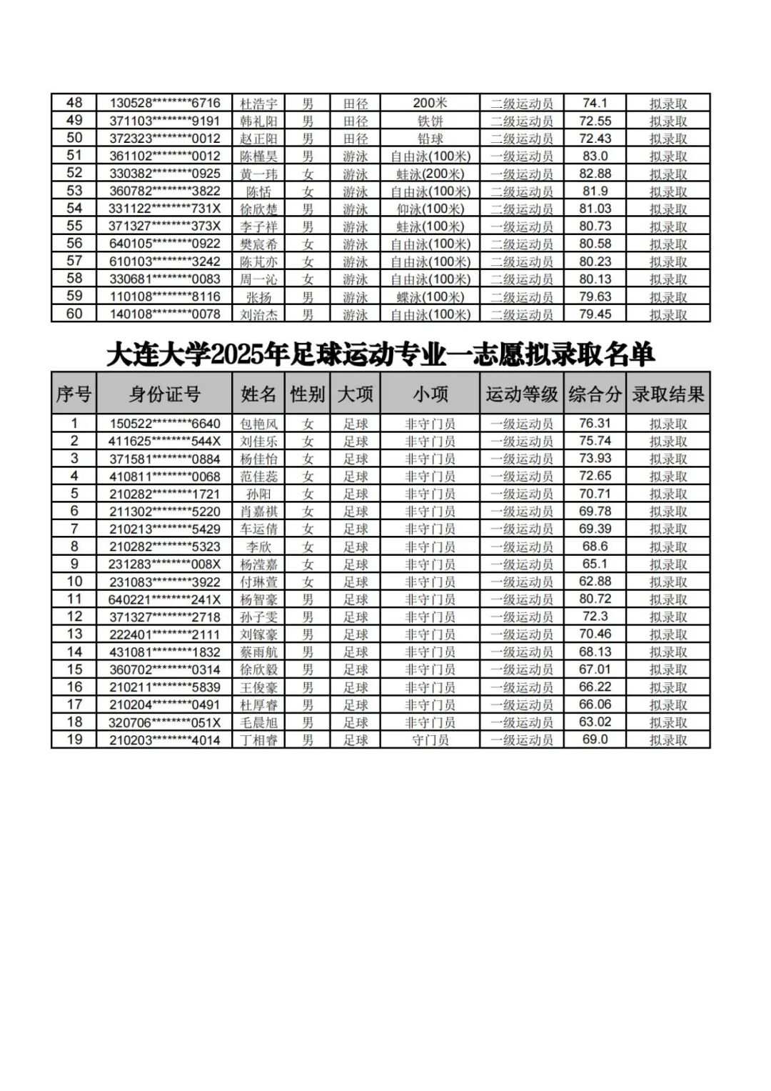 大连大学2025年运动训练及足球运动专业一志愿拟录取名单公示