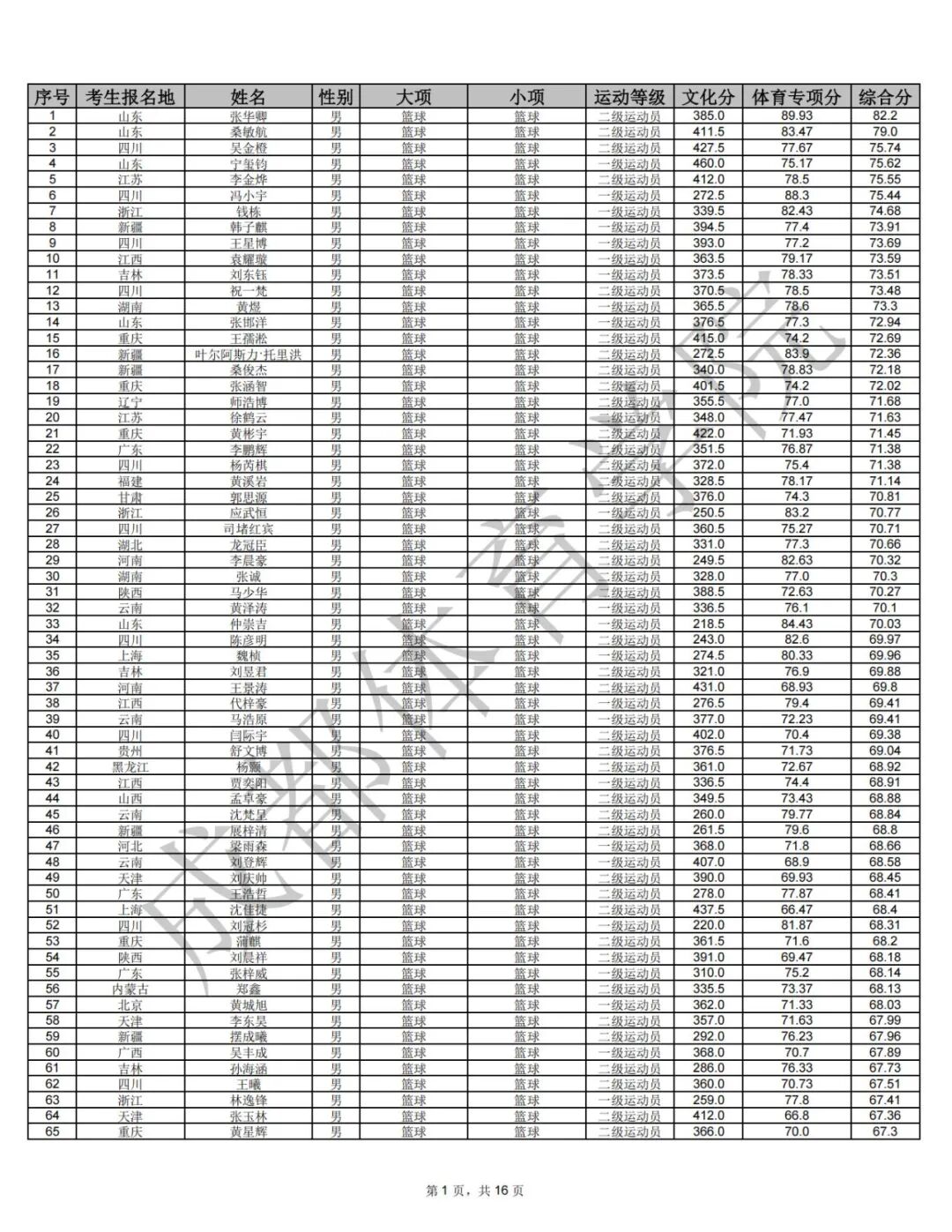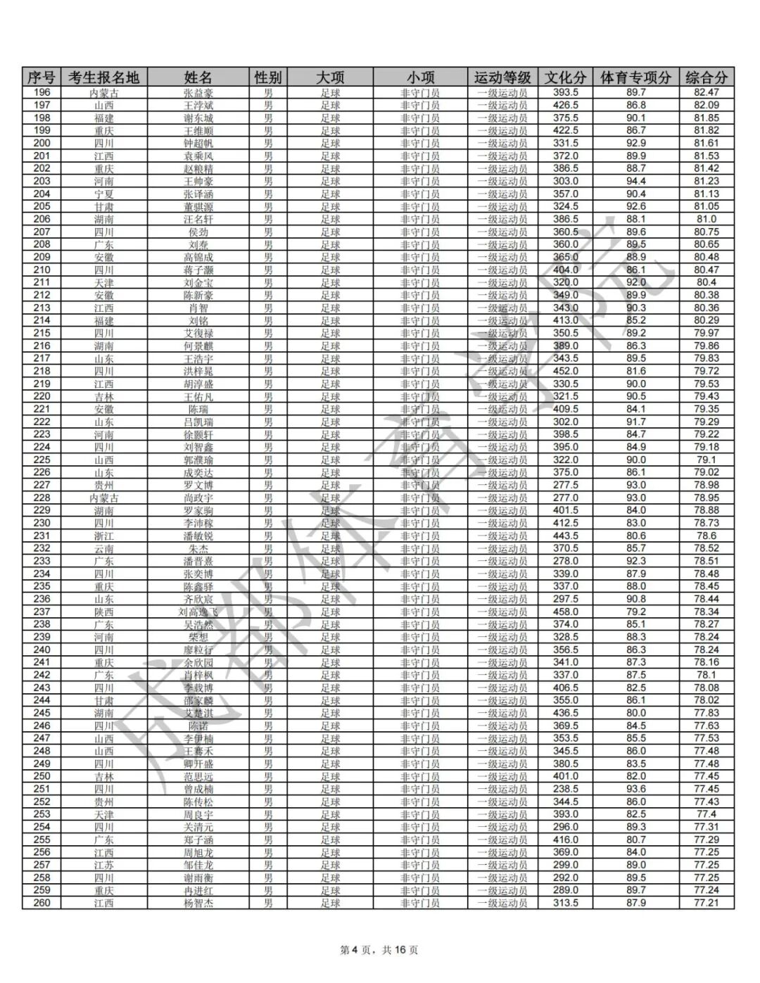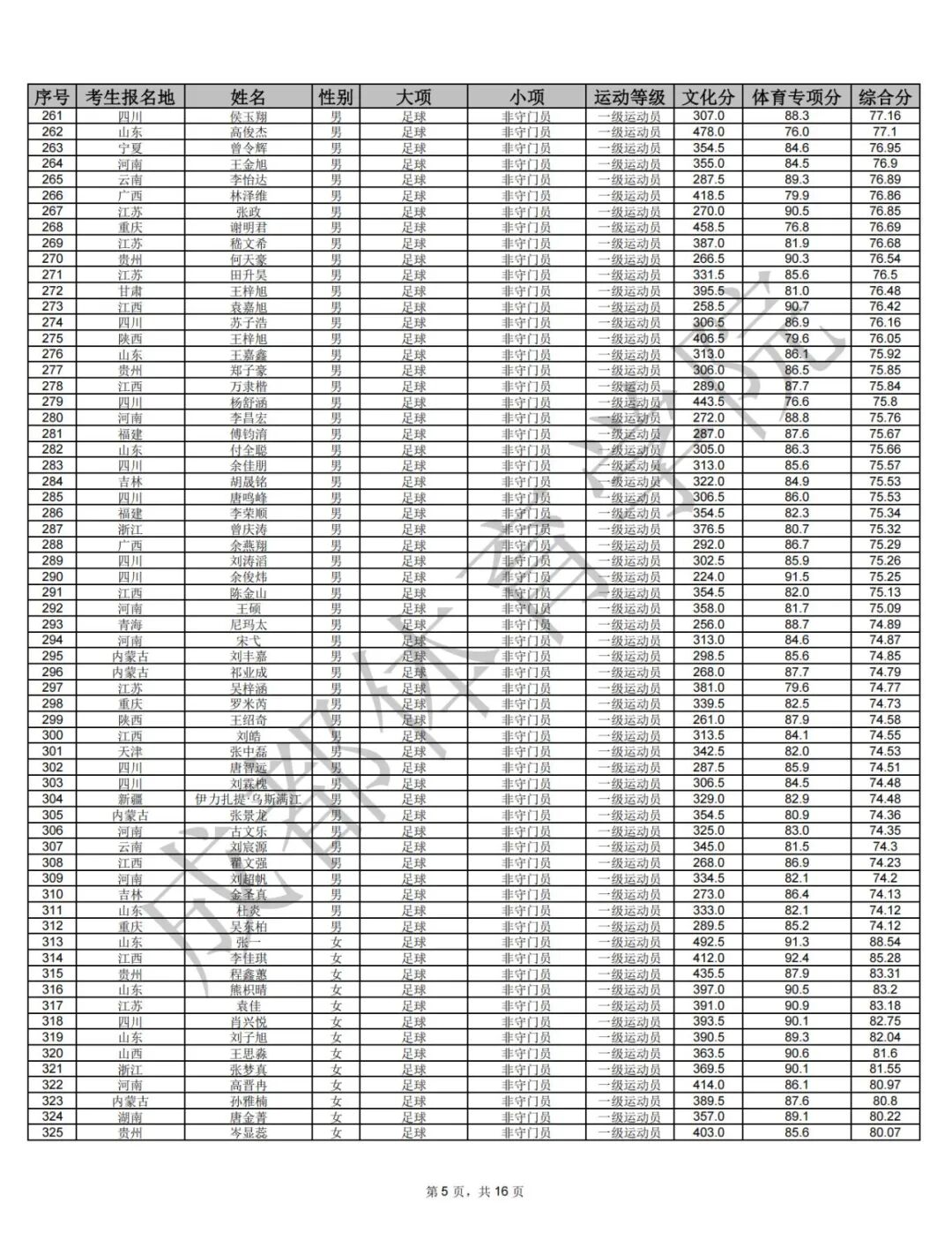 根据教育部、国家体育总局《2025年普通高校运动训练、武术与民族传统体育专业招生管理办法》(体科字〔2024〕256号)、《成都体育学院2025年运动训练、武术与民族传统体育专业招生简章》及《成都体育学院2025年足球运动专业招生办法》等相关文件规定,经成都体育学院体育单招录取领导小组审核后,现将第一志愿拟录取名单进行公示,正式录取名单以教育部、国家体育总局、各省招生部门审核通过为准。