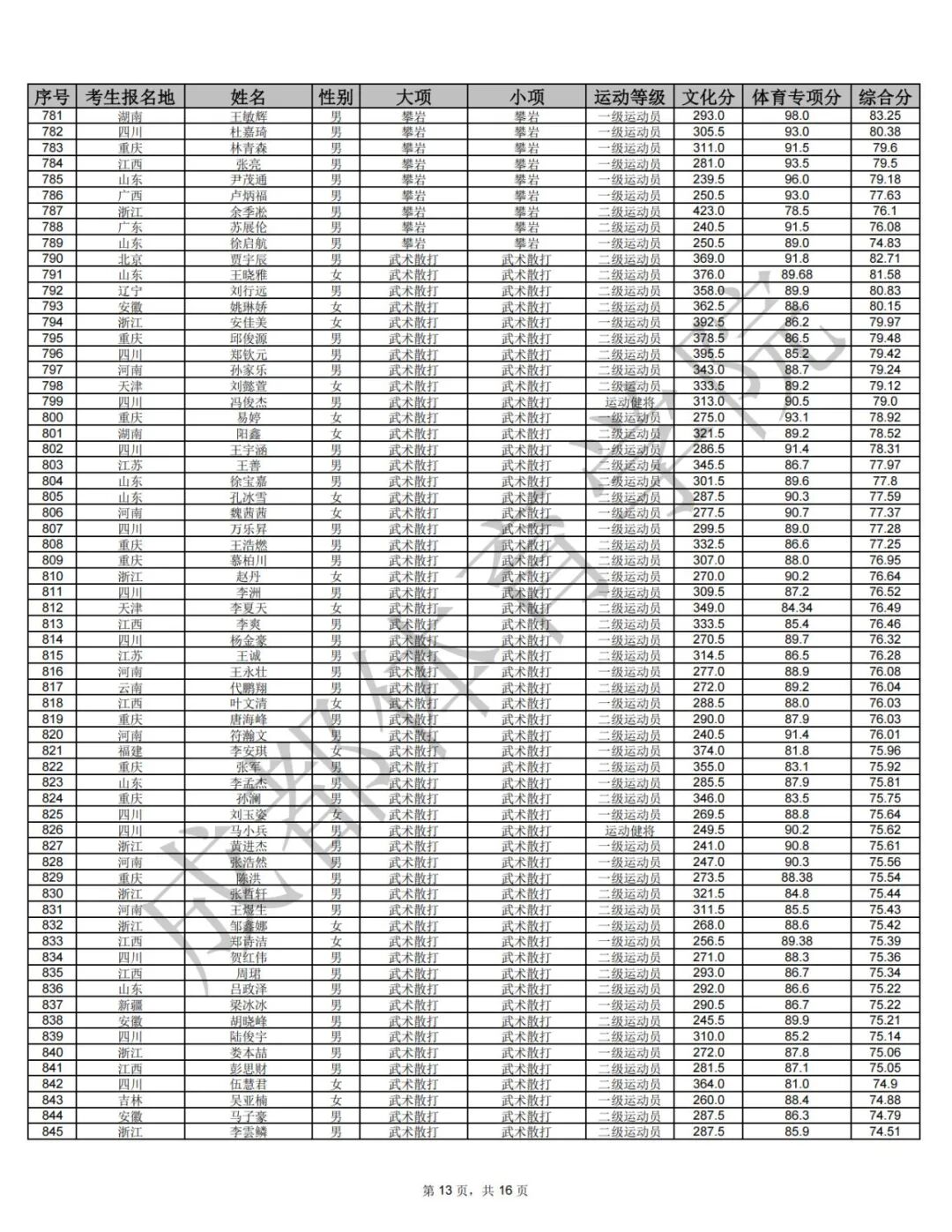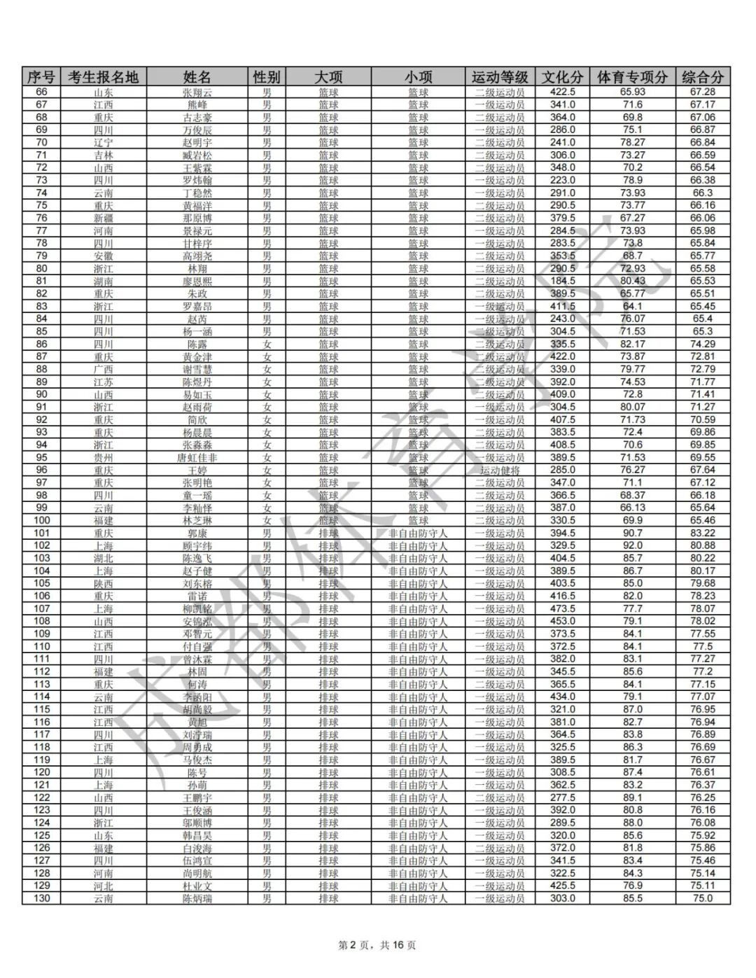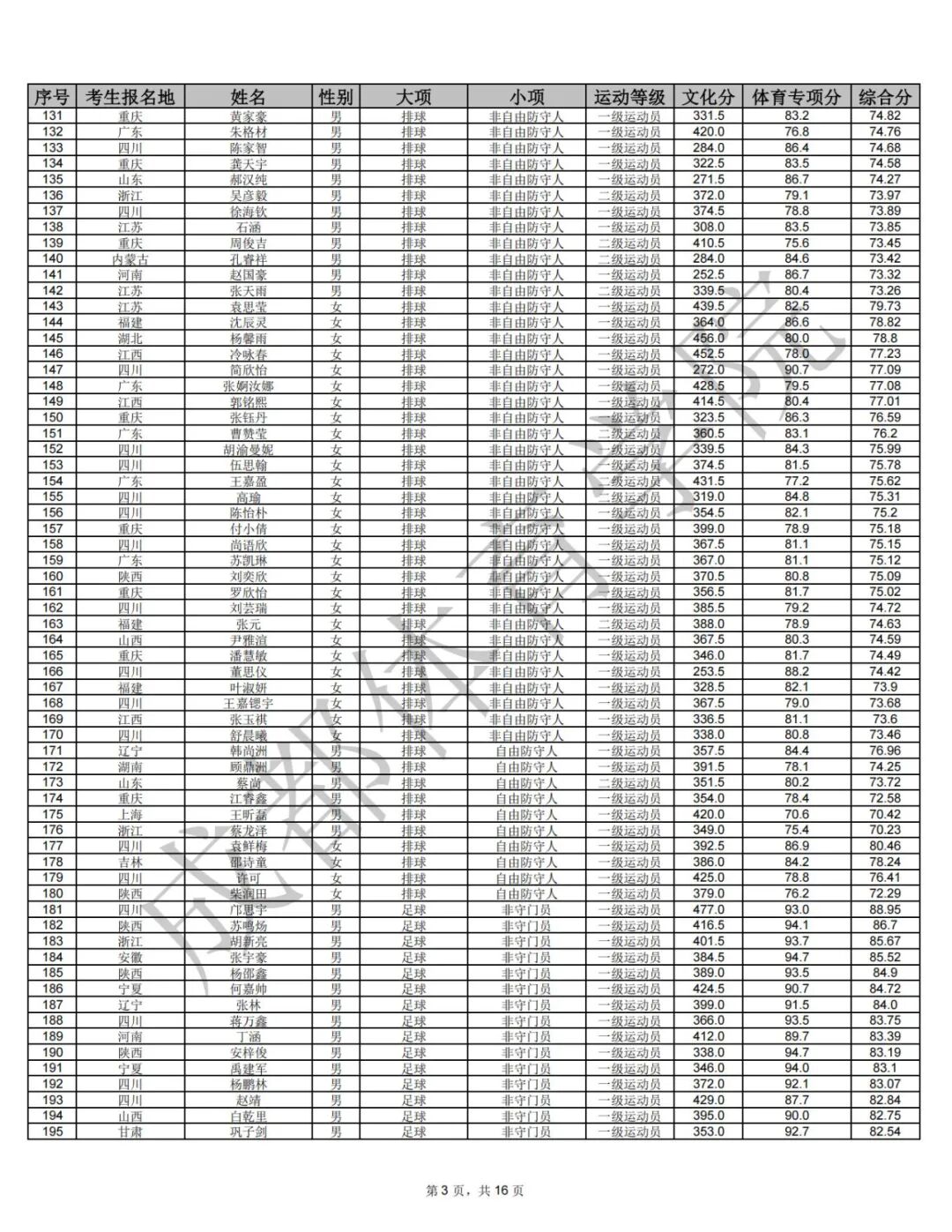 根据教育部、国家体育总局《2025年普通高校运动训练、武术与民族传统体育专业招生管理办法》(体科字〔2024〕256号)、《成都体育学院2025年运动训练、武术与民族传统体育专业招生简章》及《成都体育学院2025年足球运动专业招生办法》等相关文件规定,经成都体育学院体育单招录取领导小组审核后,现将第一志愿拟录取名单进行公示,正式录取名单以教育部、国家体育总局、各省招生部门审核通过为准。