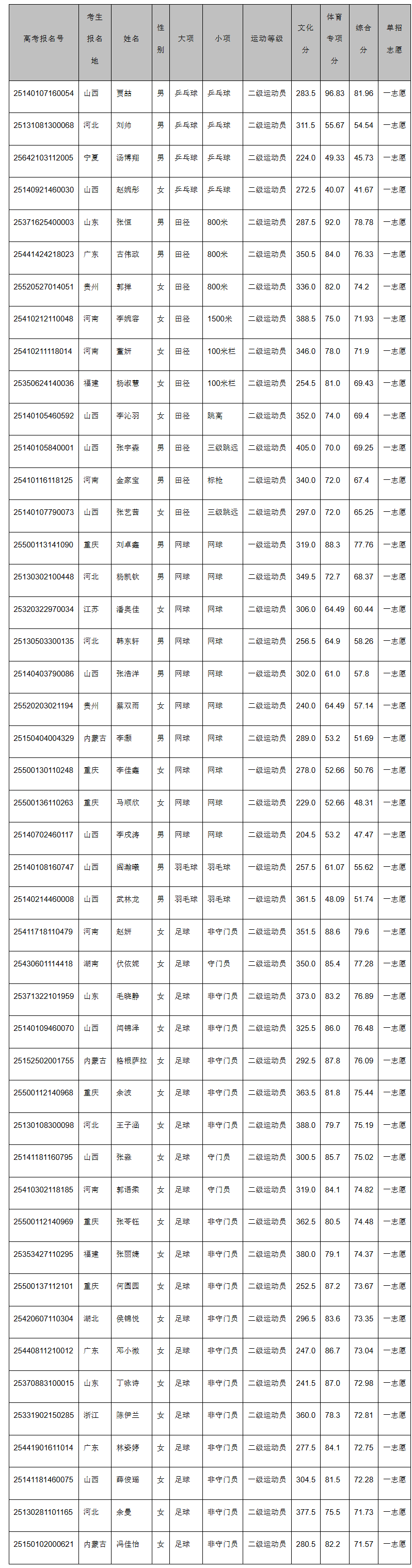 山西大同大学2025年体育单招拟录取名单
