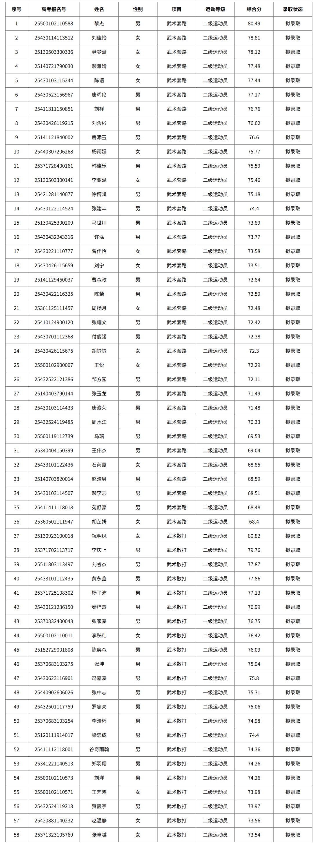 根据国家体育总局办公厅和教育部办公厅关于印发《2025年普通高等学校运动训练、武术与民族传统体育专业招生管理办法》的通知(体科字〔2024〕256号)、体育总局办公厅关于印发《<2025年普通高等学校运动训练、武术与民族传统体育专业招生管理办法>操作细则》的通知(体科字〔2024〕261号)等文件要求和规定,经学校研究决定,现将我校2025年武术与民族传统体育专业单独招生一志愿拟录取名单予以公示。公示时间为5月23日至5月30日,招生办咨询电话:0743-8564141,纪检监督电话:0743-8564814。