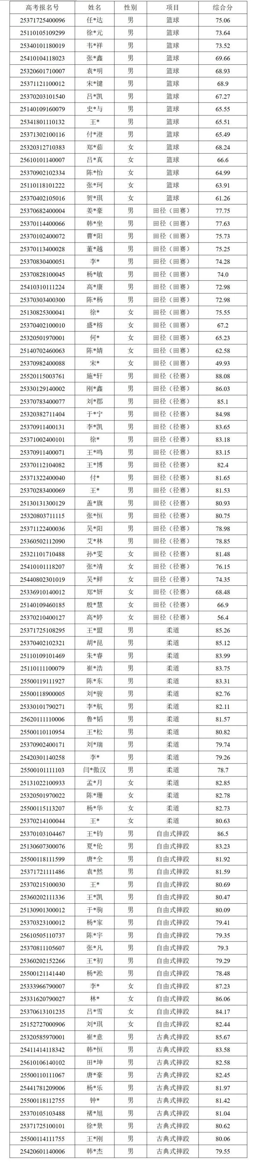 烟台大学2025年运动训练专业拟录取名单公示