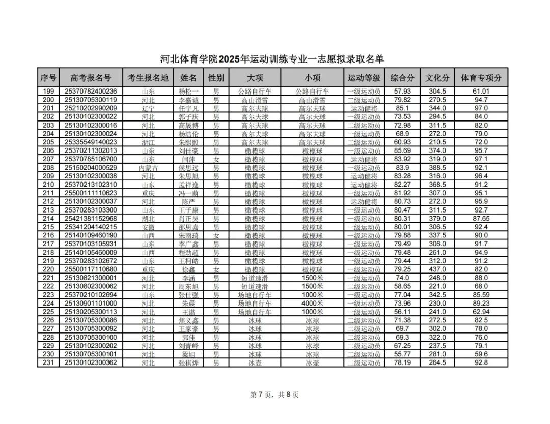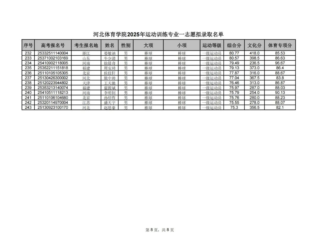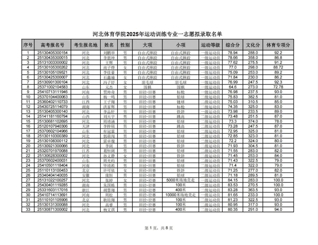 附件1:河北体育学院2025年运动训练专业一志愿拟录取名单