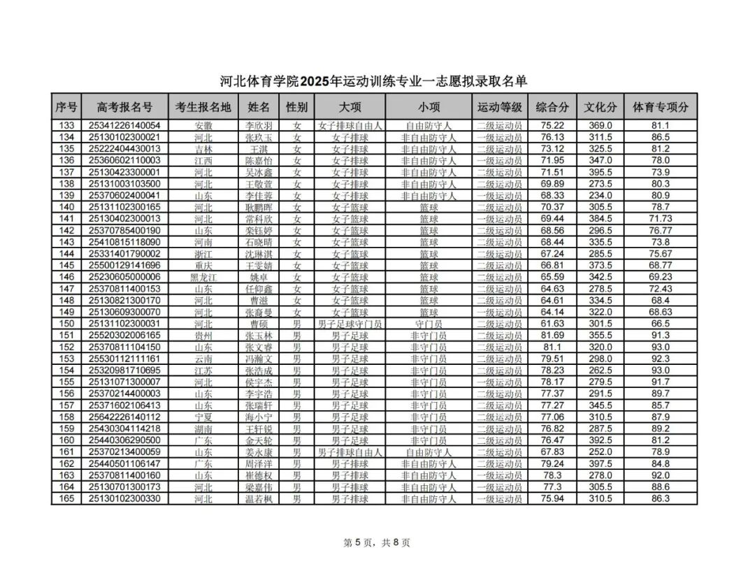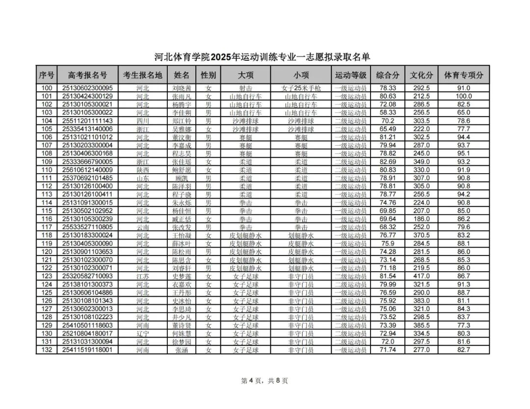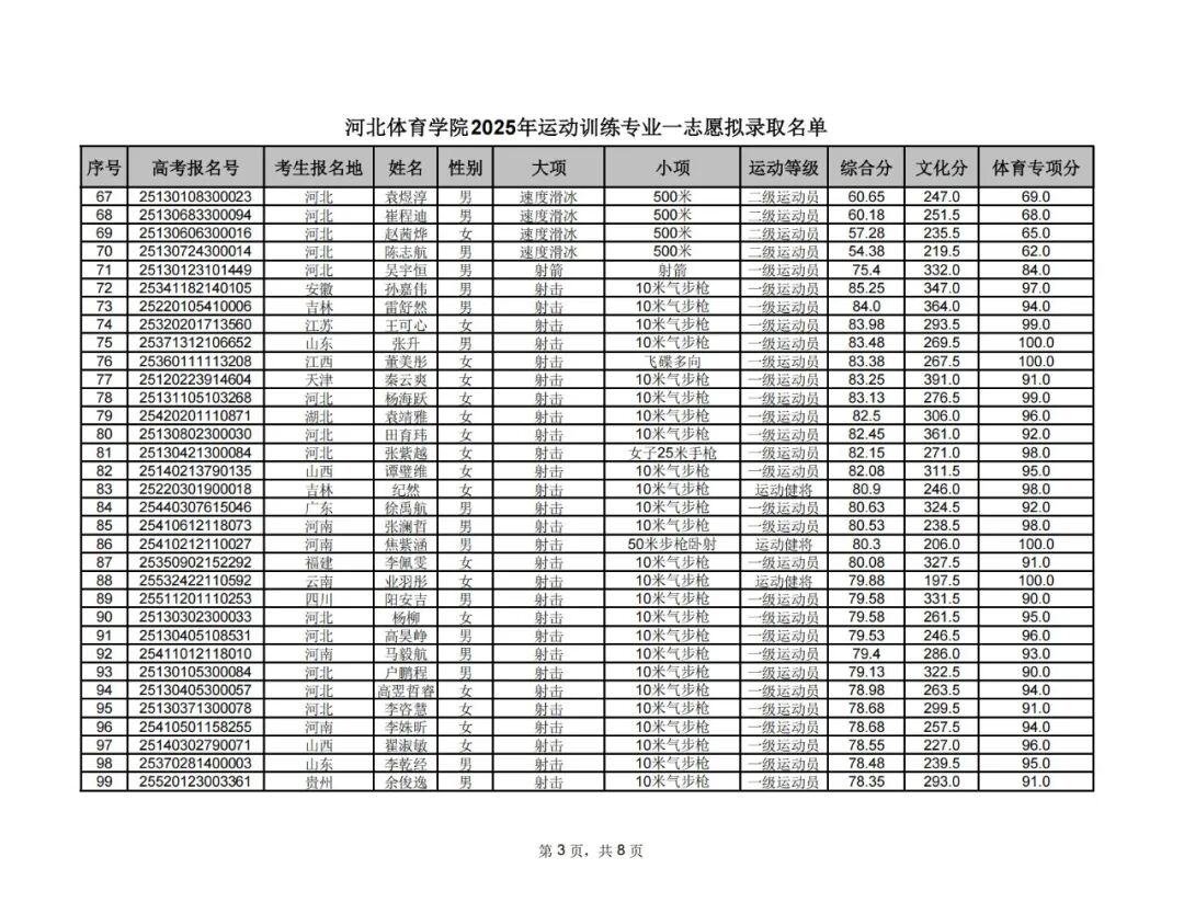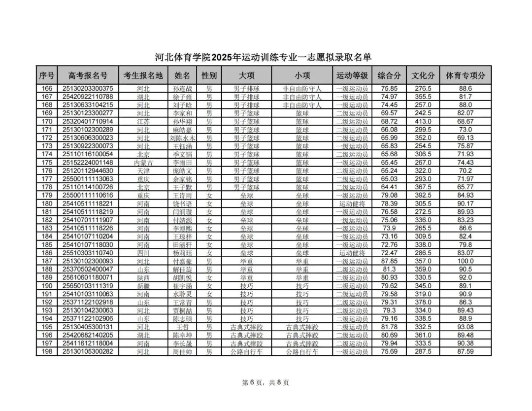 附件1:河北体育学院2025年运动训练专业一志愿拟录取名单