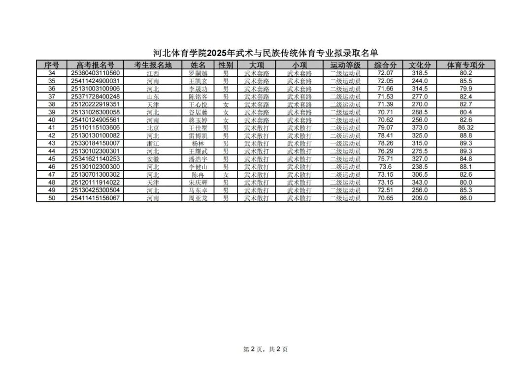 附件2:河北体育学院2025年武术与民族传统体育专业拟录取名单