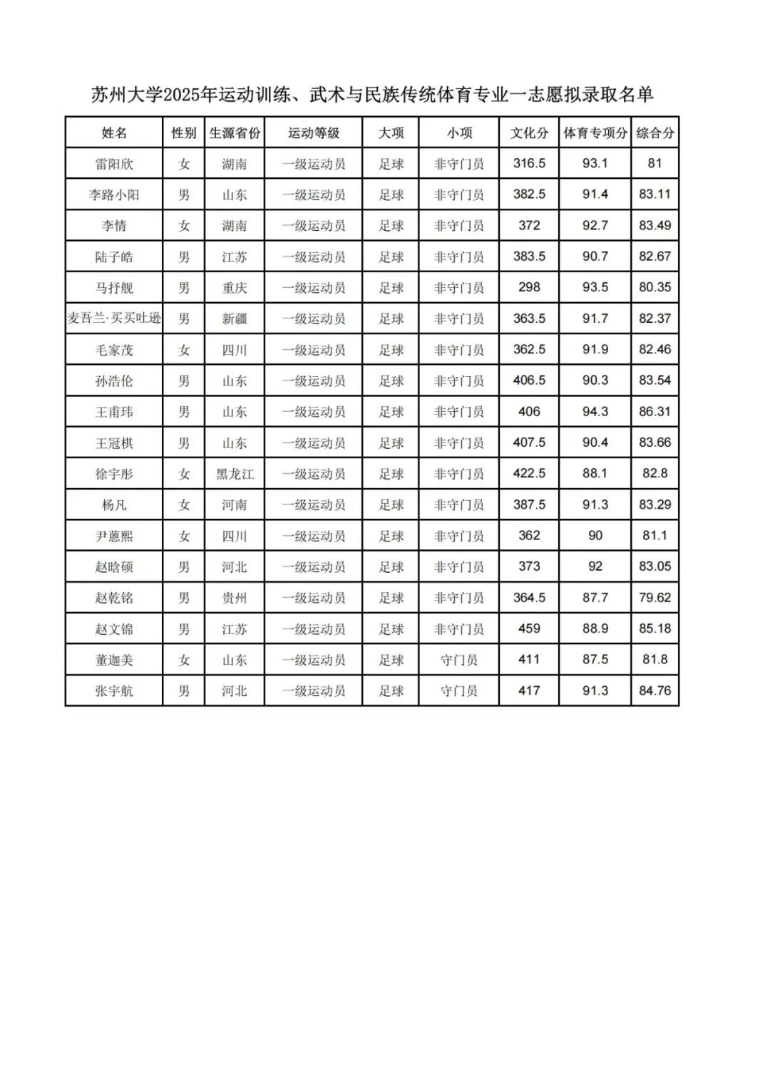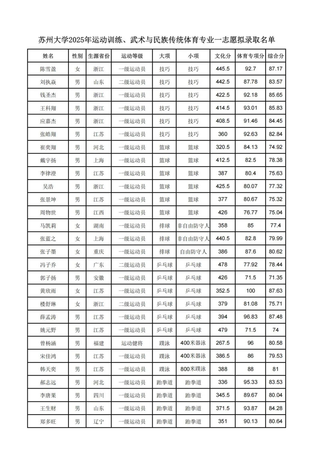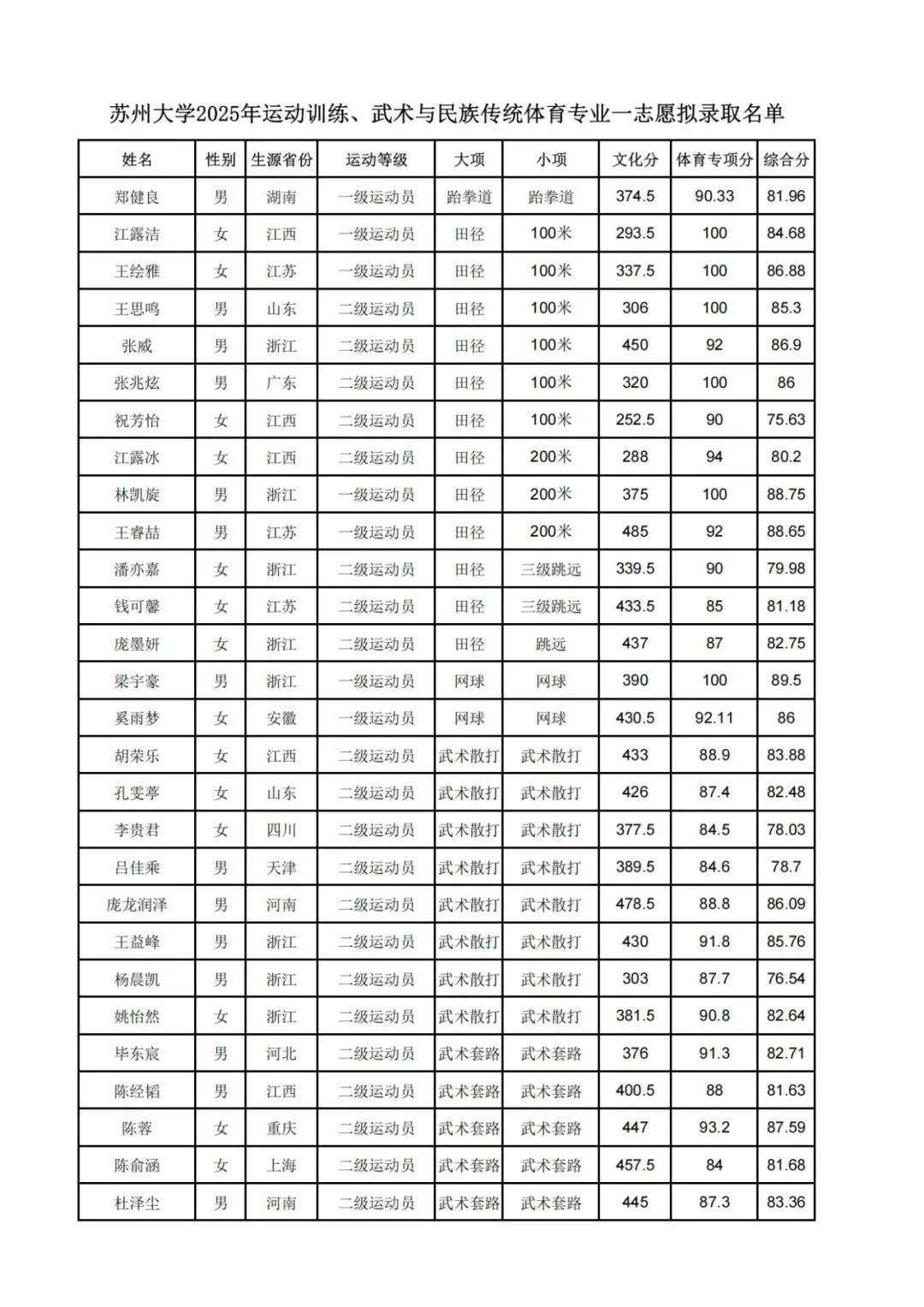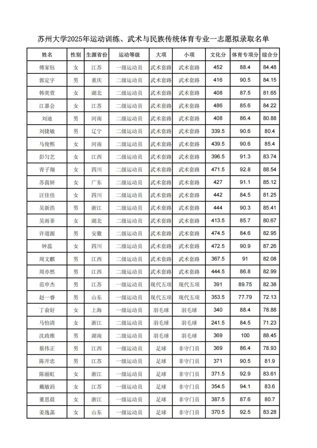 苏州大学2025年运动训练、武术与民族传统体育专业 一志愿拟录取名单公示