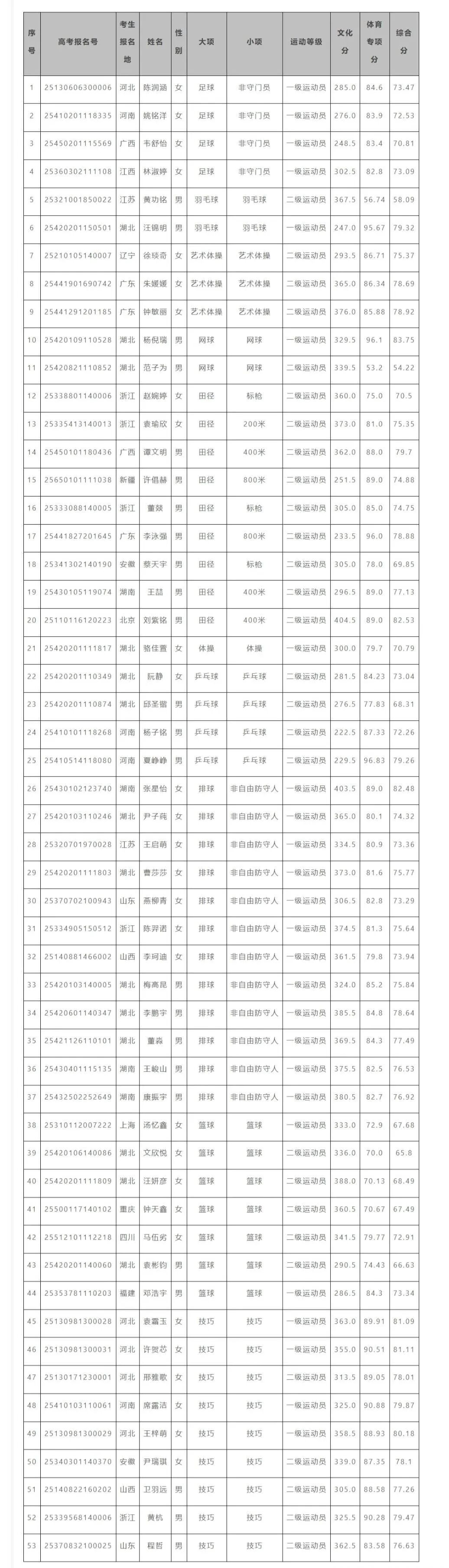 根据《2025年普通高等学校运动训练、武术与民族传统体育专业招生管理办法》(体科字﹝2024﹞256号)《湖北师范大学2025年运动训练专业招生简章》文件规定,确定2025年运动训练专业考生一志愿拟录取名单如下,正式录取名单以教育部、国家体育总局及各省招生部门审核过为准。