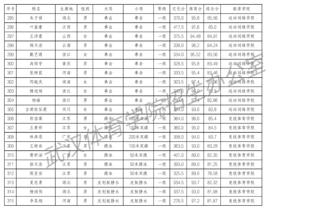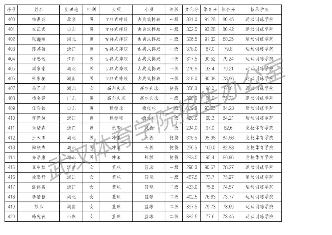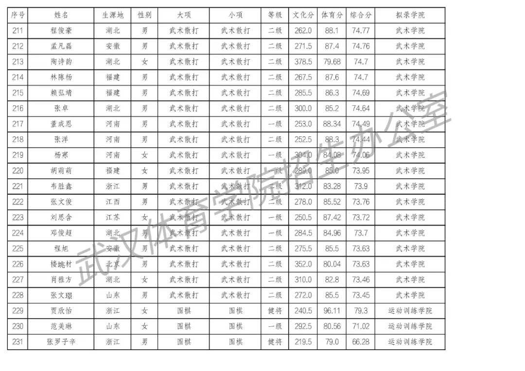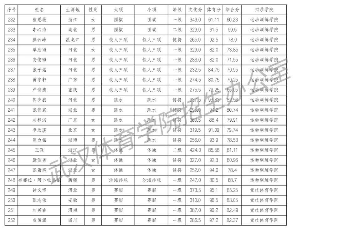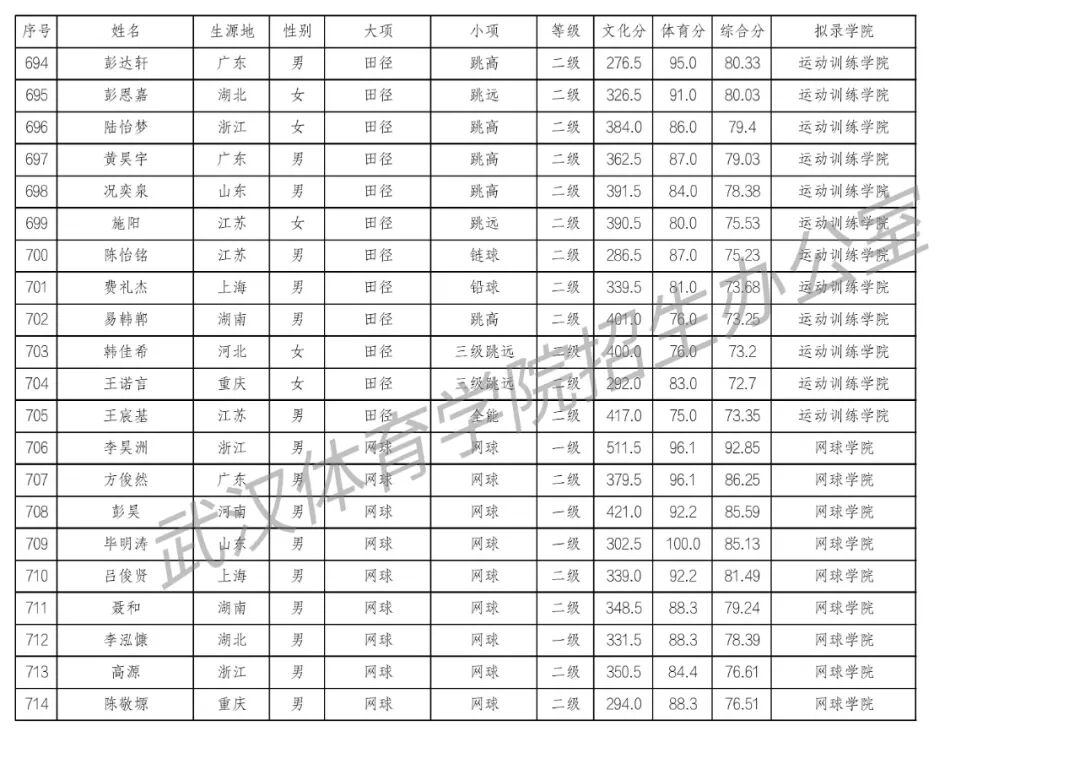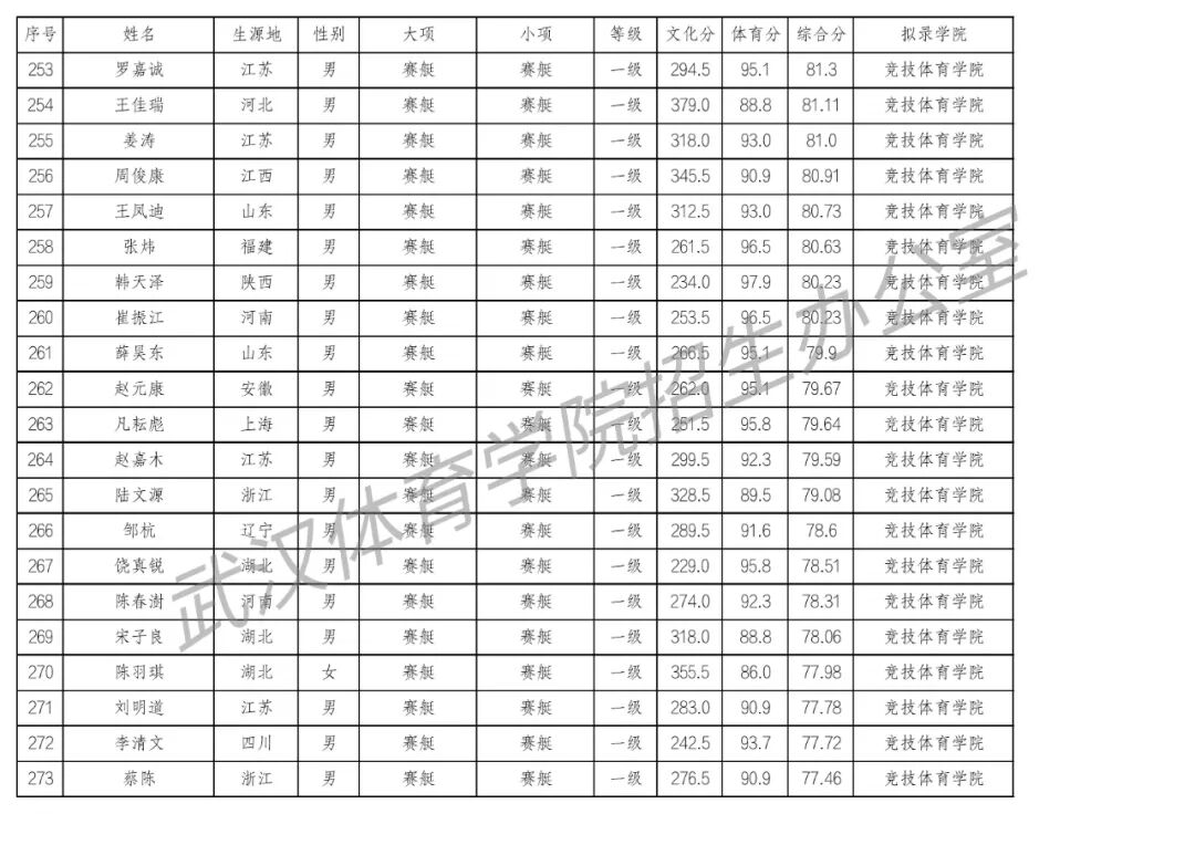根据国家体育总局办公厅、教育部办公厅印发的《2025年普通高等学校运动训练、武术与民族传统体育专业招生管理办法》(体科字〔2024〕256号)和《武汉体育学院2025年运动训练、武术与民族传统体育、足球运动专业招生简章》相关要求及原则,现将一志愿拟录取名单进行公示,正式录取名单以教育部、国家体育总局、各省招生部门审核通过为准。