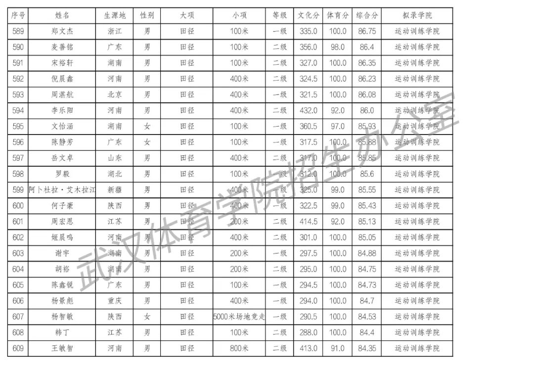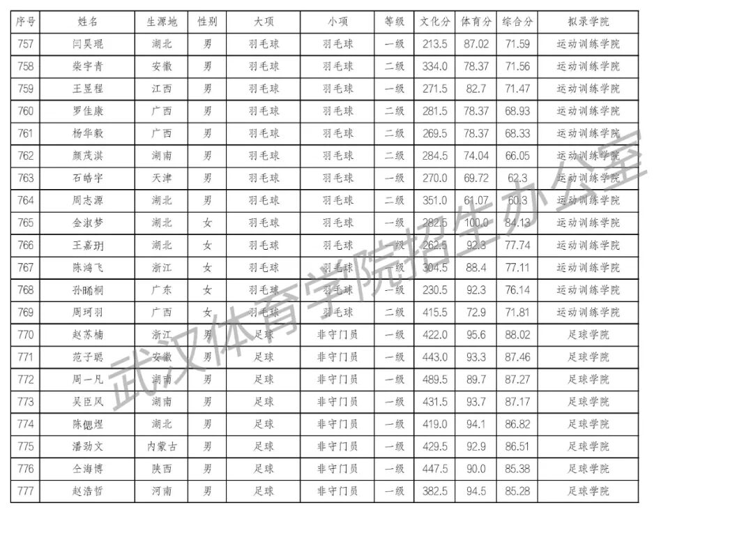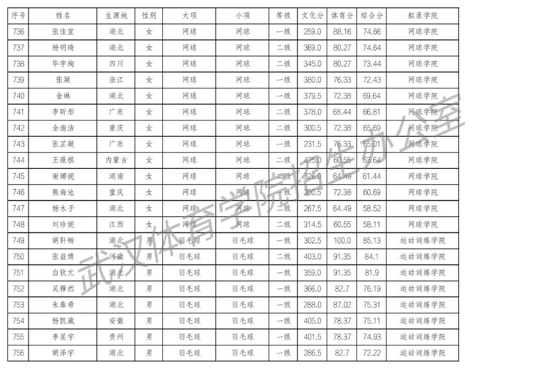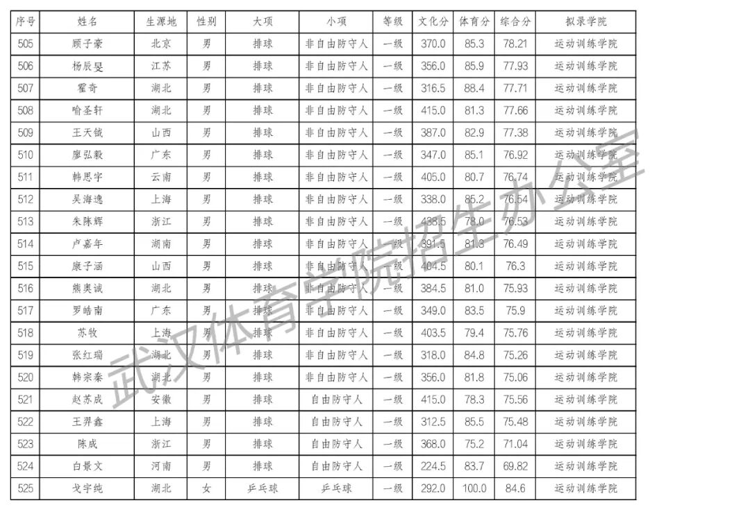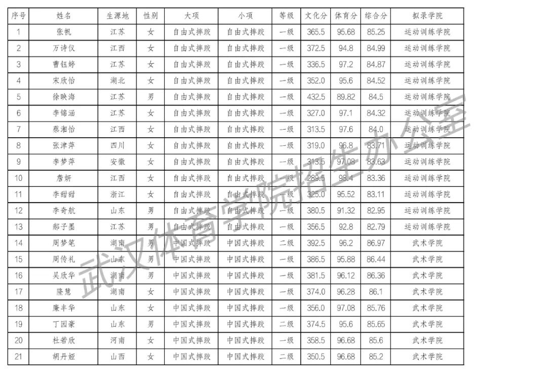 根据国家体育总局办公厅、教育部办公厅印发的《2025年普通高等学校运动训练、武术与民族传统体育专业招生管理办法》(体科字〔2024〕256号)和《武汉体育学院2025年运动训练、武术与民族传统体育、足球运动专业招生简章》相关要求及原则,现将一志愿拟录取名单进行公示,正式录取名单以教育部、国家体育总局、各省招生部门审核通过为准。