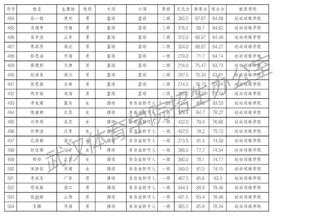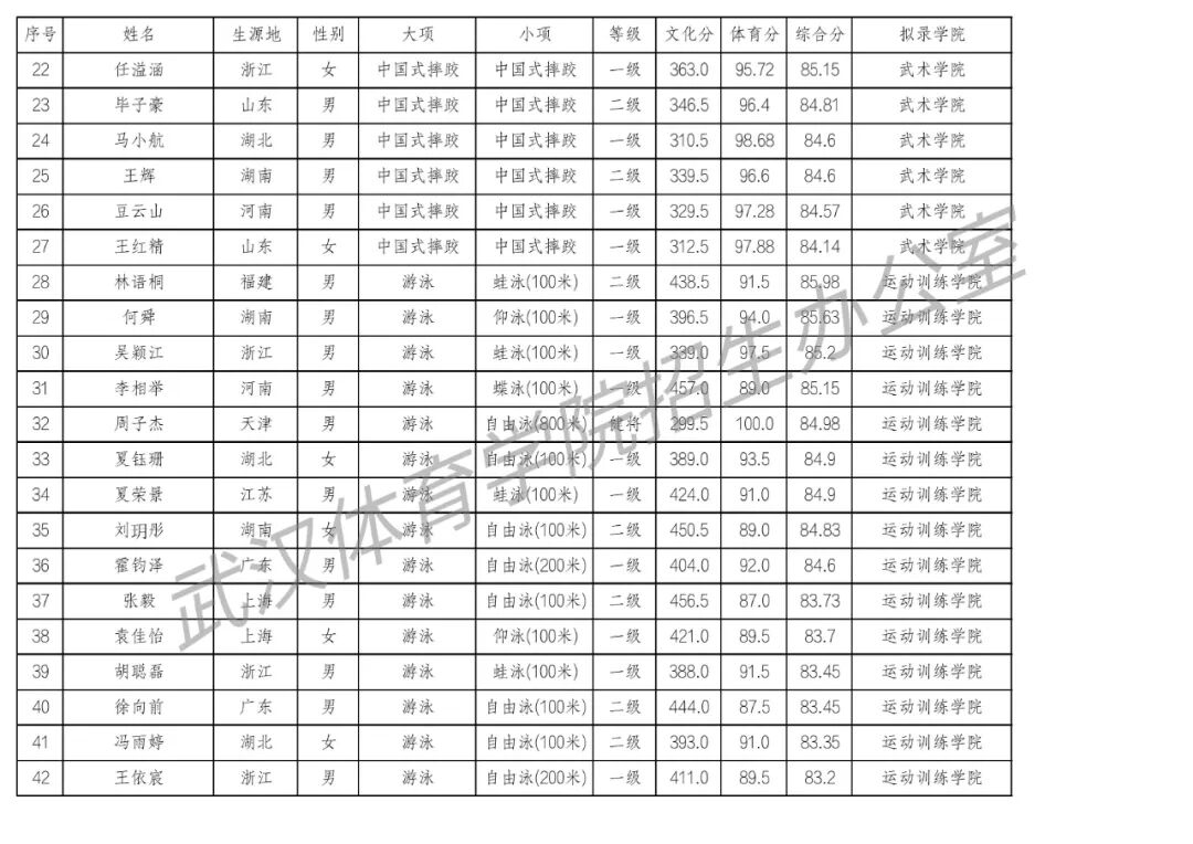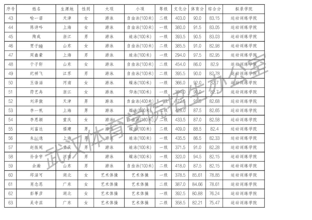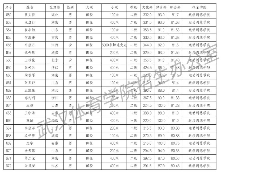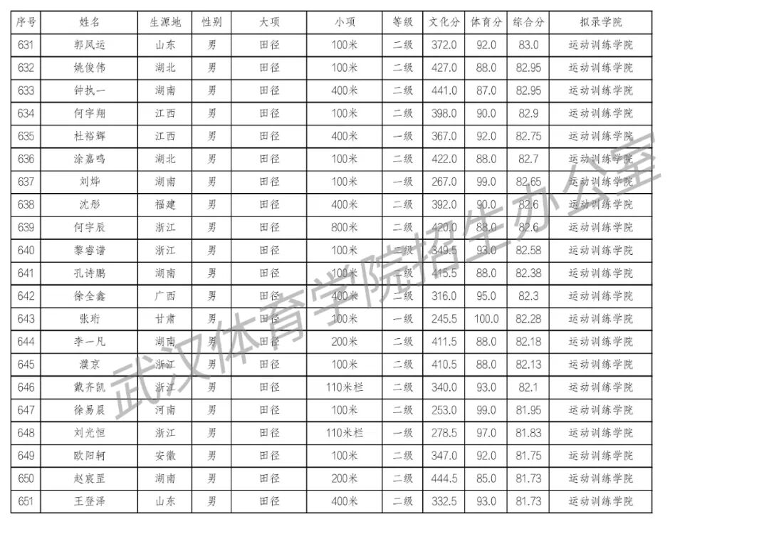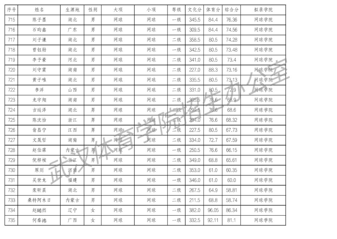 根据国家体育总局办公厅、教育部办公厅印发的《2025年普通高等学校运动训练、武术与民族传统体育专业招生管理办法》(体科字〔2024〕256号)和《武汉体育学院2025年运动训练、武术与民族传统体育、足球运动专业招生简章》相关要求及原则,现将一志愿拟录取名单进行公示,正式录取名单以教育部、国家体育总局、各省招生部门审核通过为准。